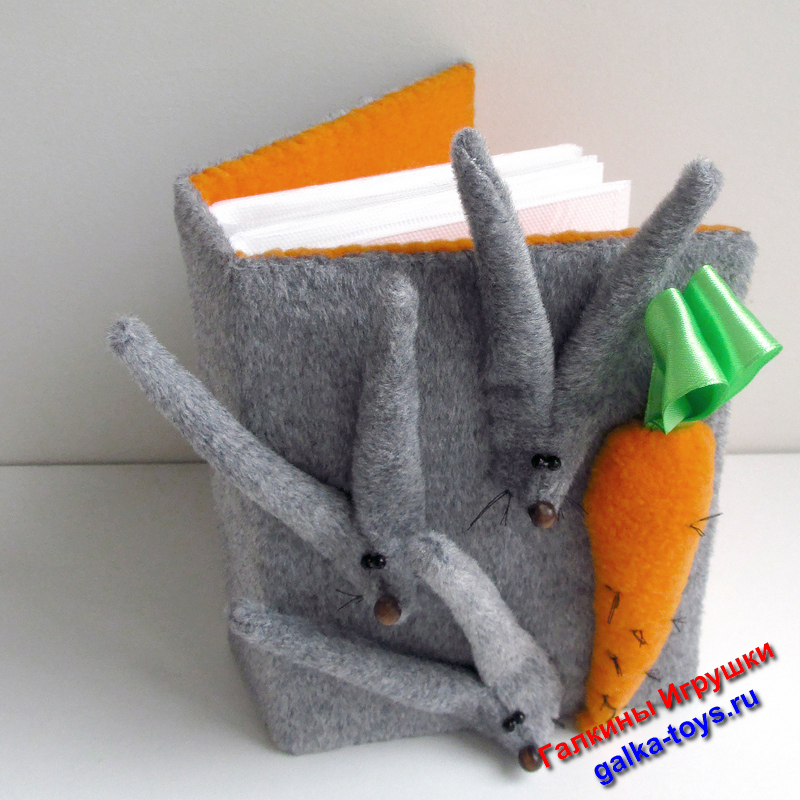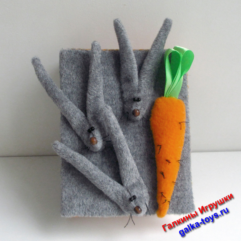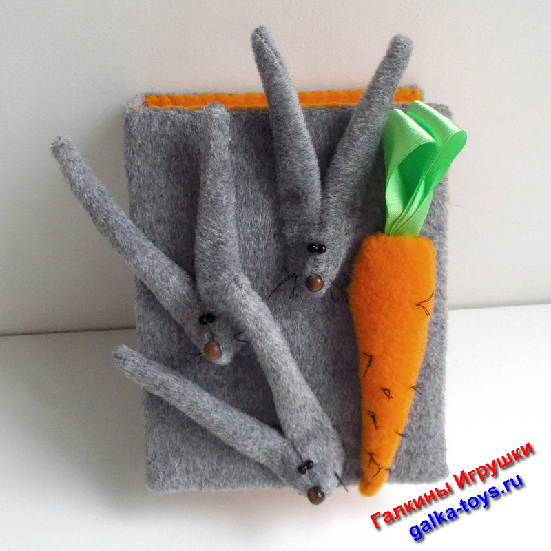 На обложке три мордашки зайчиков и морковка. Глазки и носики — бусины.