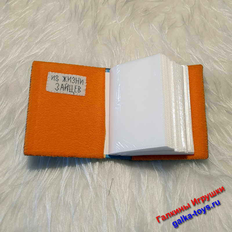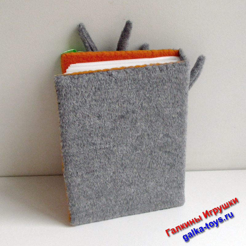 Сшит из серой пушистой пальтовой ткани. Внутри фотоальбома отделка оранжевый флис.