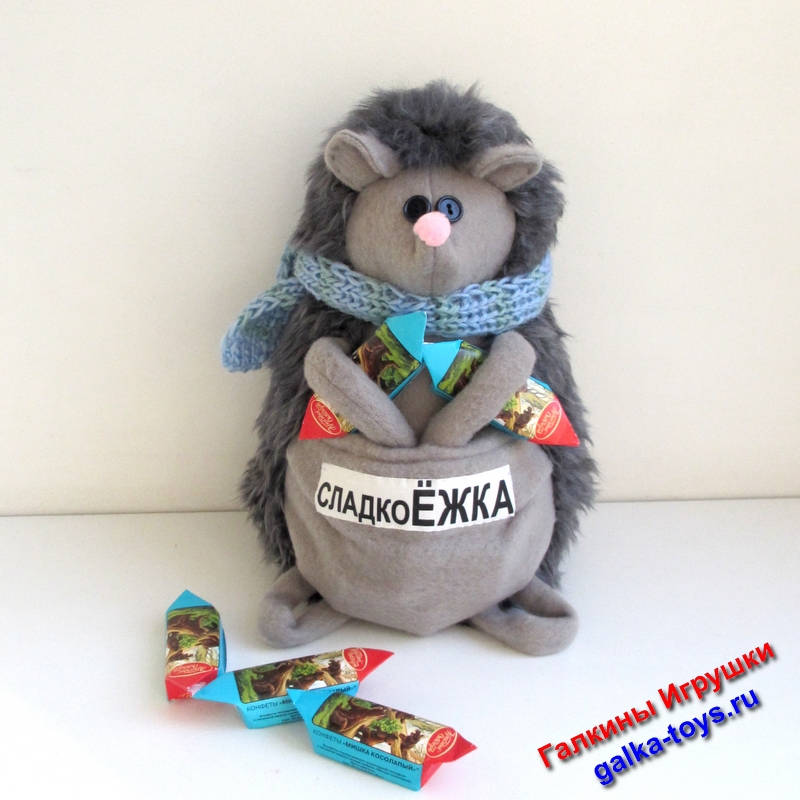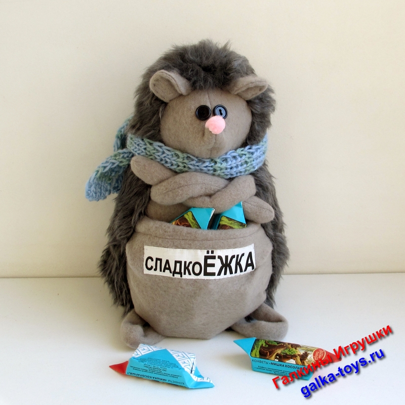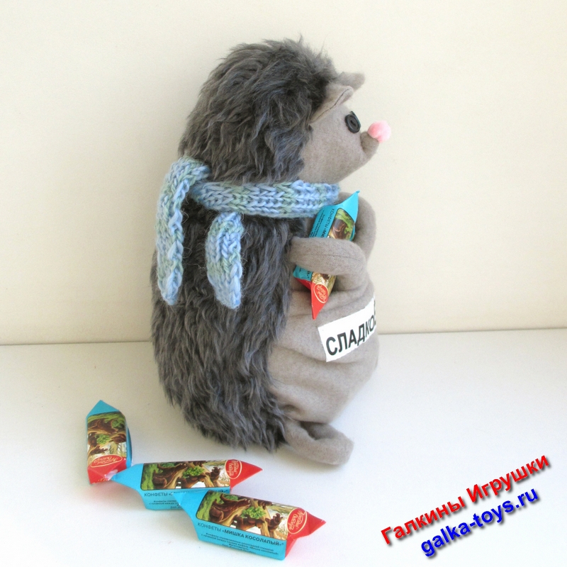 На животике есть большой кармашек для конфеток и шоколадок. Счастливый Ёжик любит погрызть сам и всегда угостит Вас. Он совсем не жадный!!!