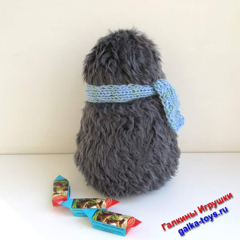 Материалы:  серый флис, серый искусственный мех, принт на ткани, холлофайбер, пуговицы, помпон, полушерстяная голубая пряжа
