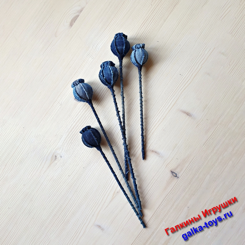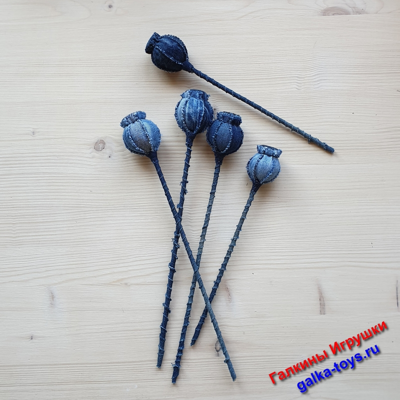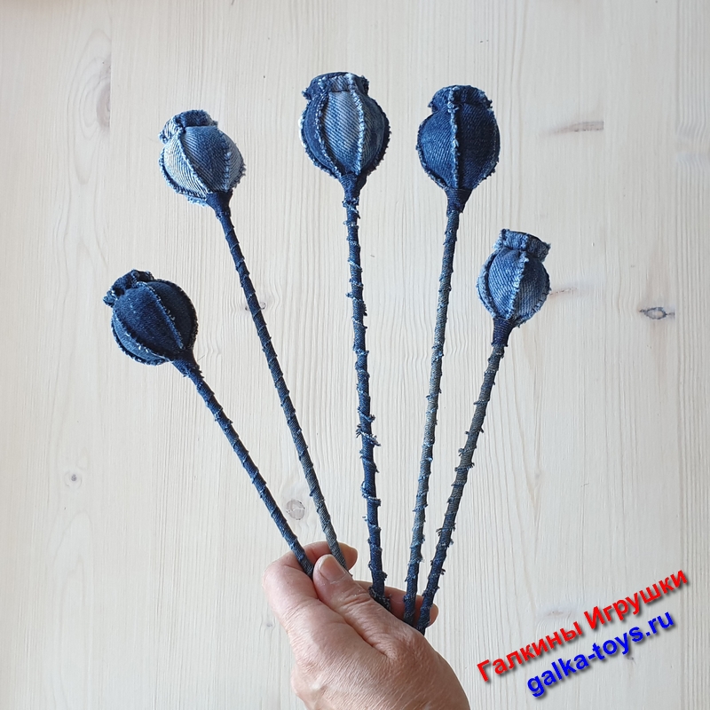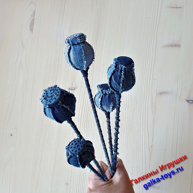 Моя волшебная коробочка мака — цветы из джинсовой ткани с холлофайбером внутри, в стебле деревянная шпажка. Не очень сложные в исполнении, но очень красивые.