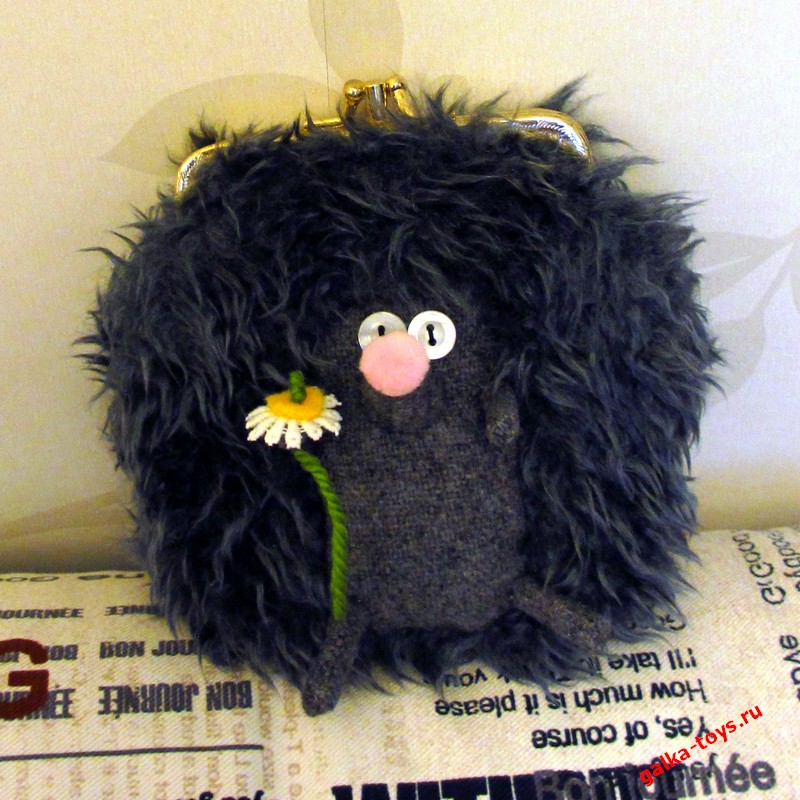 Детская сумка через плечо сшита из серого мягкого искусственного меха, глазки — пуговицы, нос — помпон, живот — костюмная ткань.