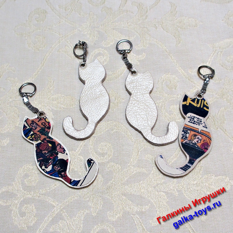 Посмотрите! Это Кот — брелок из кожи для ключей ручной работы. Сделан из двух типов натуральной кожи: тонкой с напечатанным изображением и двух слоев толстой свиной.