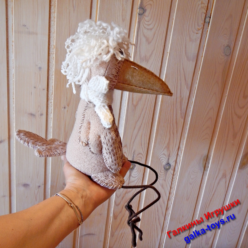 Наполнитель холлофайбер, глазки — пуговки, клюв из фетра. В крылышках проволочка. Ножки из толстой проволоки вставленной в серый полиэфирный шнур.. Легко гнутся и дают возможность варьировать разные позы.