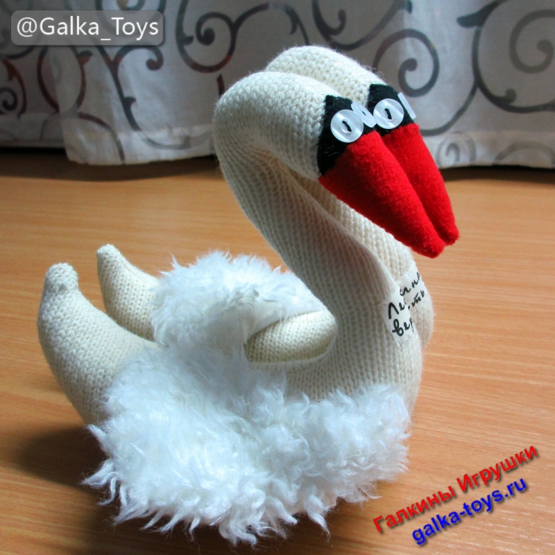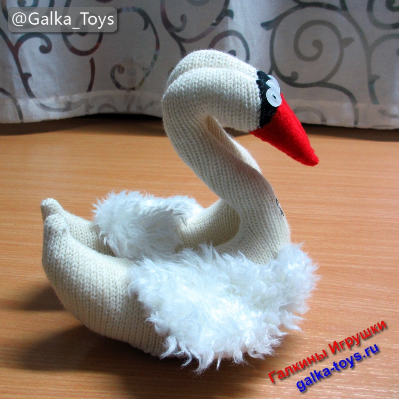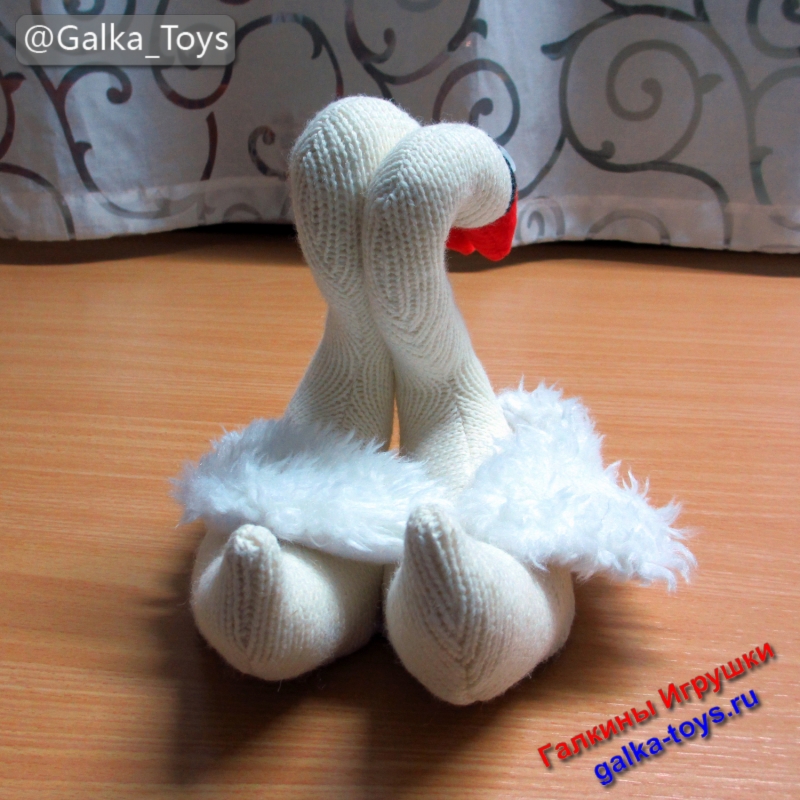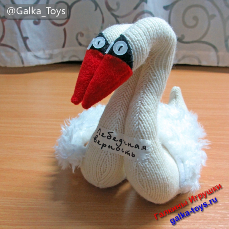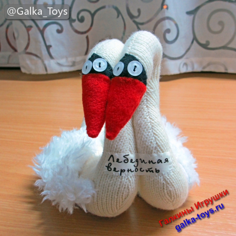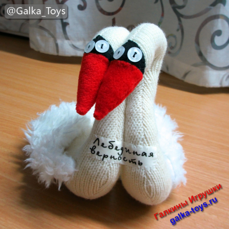 Мягкая авторская игрушка влюбленные лебеди, выполненные из белоснежного трикотажа, с глазками-пуговками и красными флисовыми клювами.