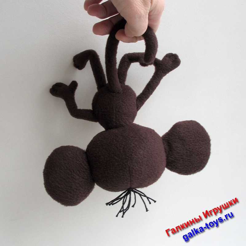 Сшита из коричневого флиса, ушки, мордочка и животик — из бежевого. Глазки из фетра и пуговиц. Ноздри — бусины. Наполнитель — холлофайбер.
