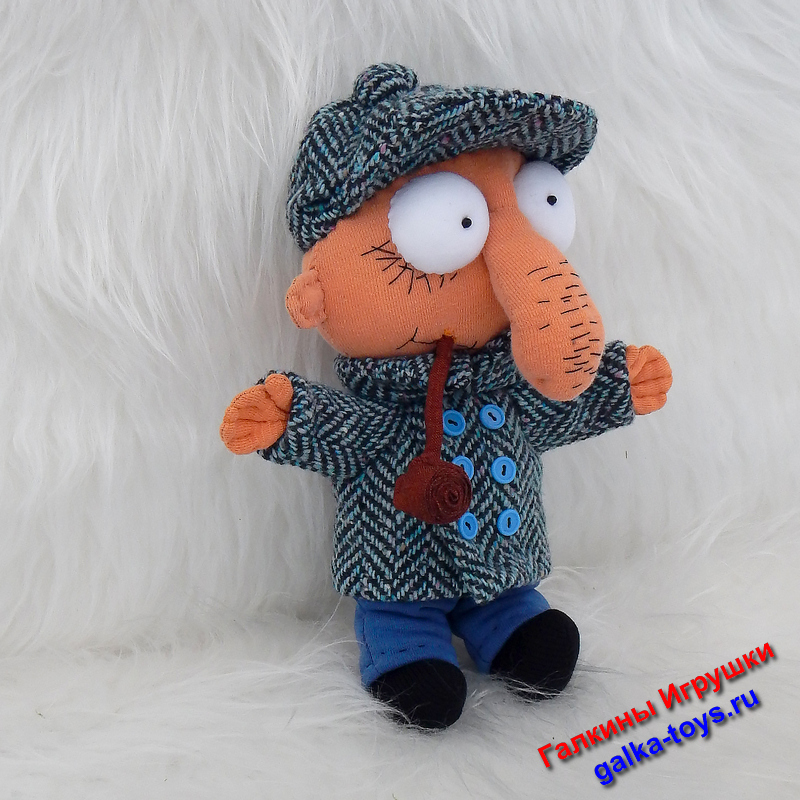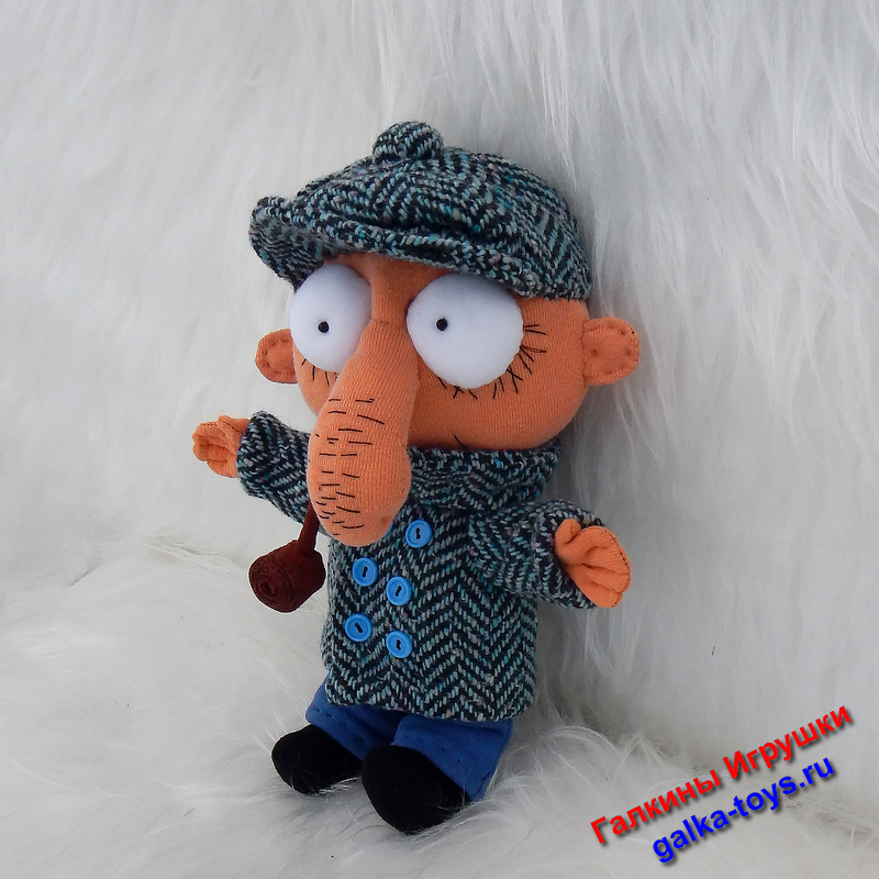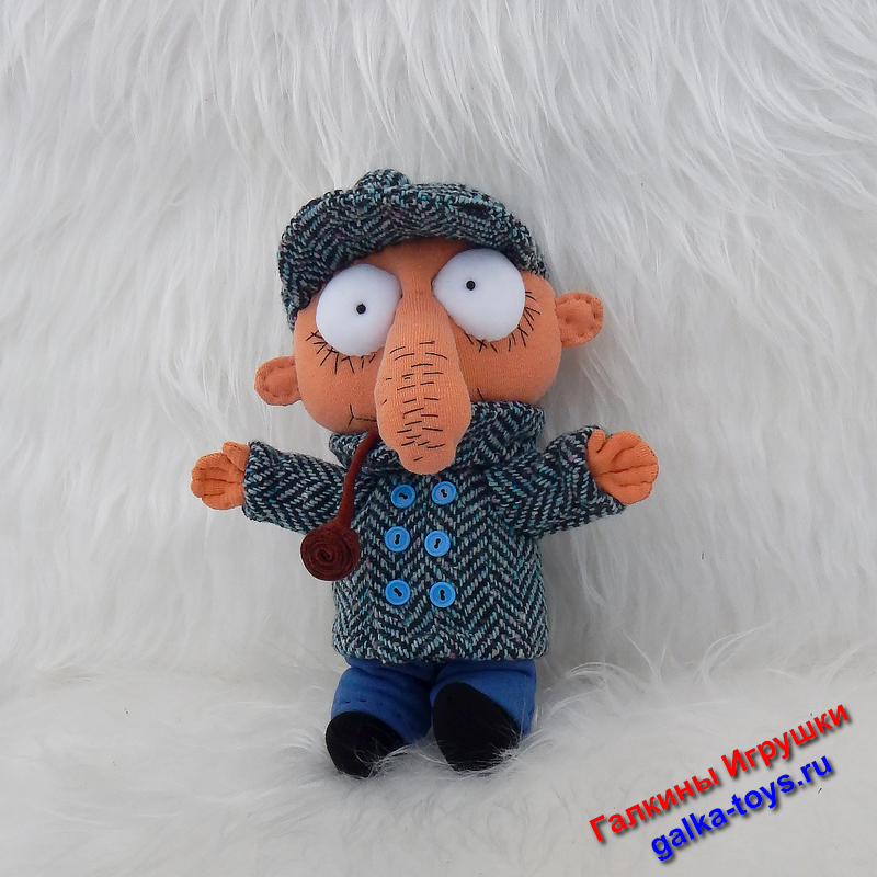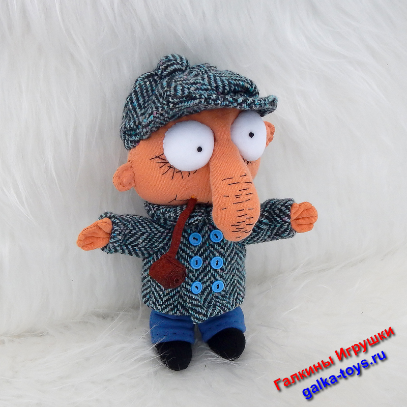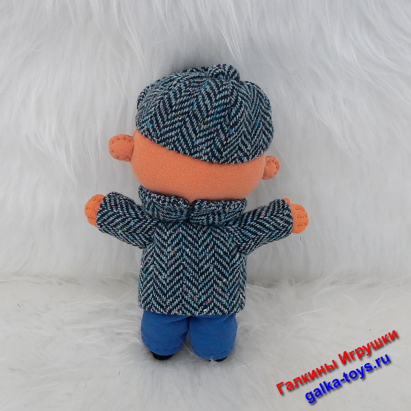 Глаза, тело и ботинки выполнены из трикотажного полотна. Зрачки — бусины. Брюки из синего футера. Наполнитель холлофайбер.