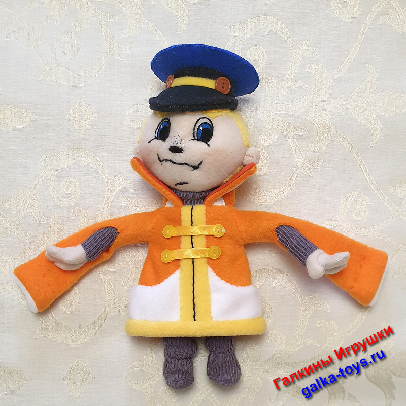 Симпатичный мультипликационный персонаж - это шитая мягкая игрушка. Тельце, ручки, голова, ушки из флиса телесного цвета; кафтан из оранжевого.