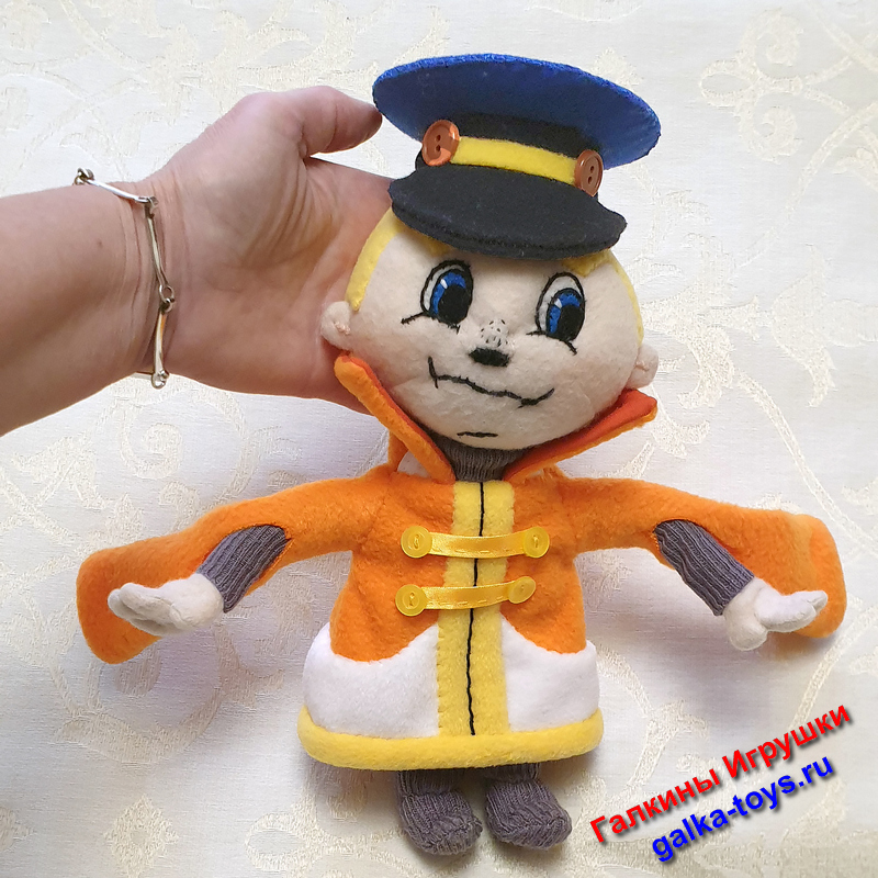 Фуражка из синего сатина. Сапоги, водолазка - сиреневое трикотажное полотно. Наполнитель холлофайбер.