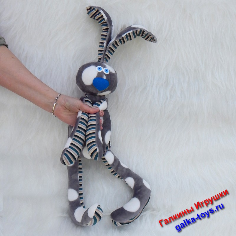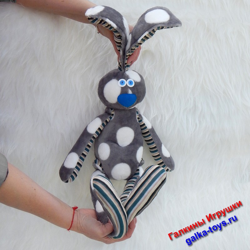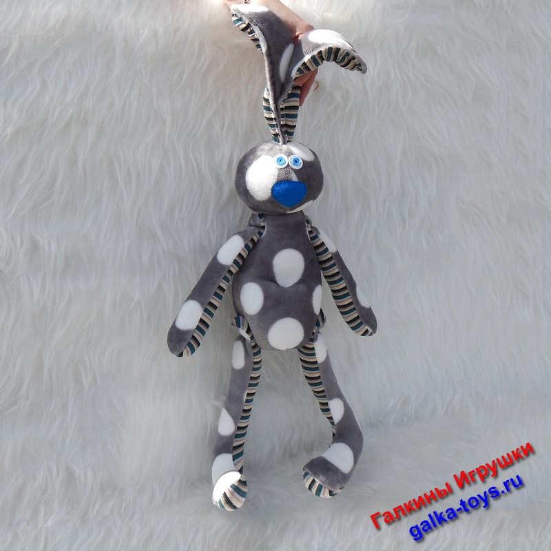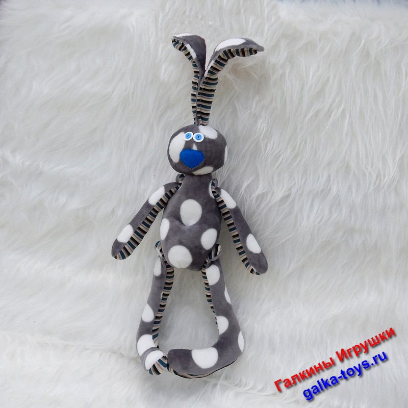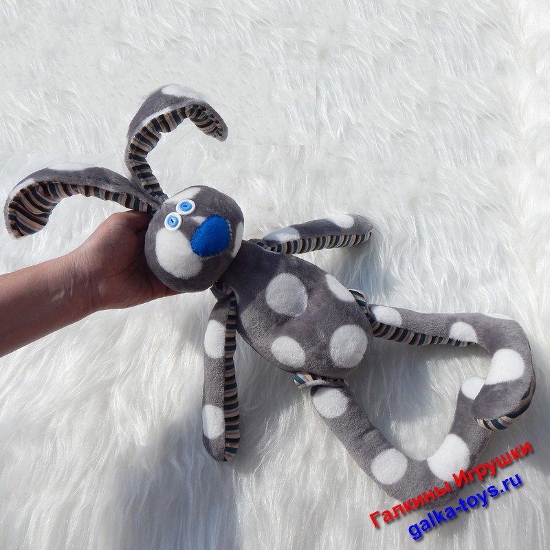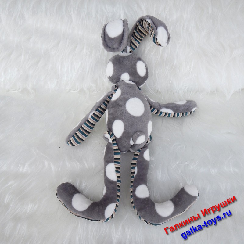 Сам из серого плюша в белый горошек. Внутренняя часть лапок и ушек из полосатого трикотажного полотна. Наполнитель — холлофайбер.
