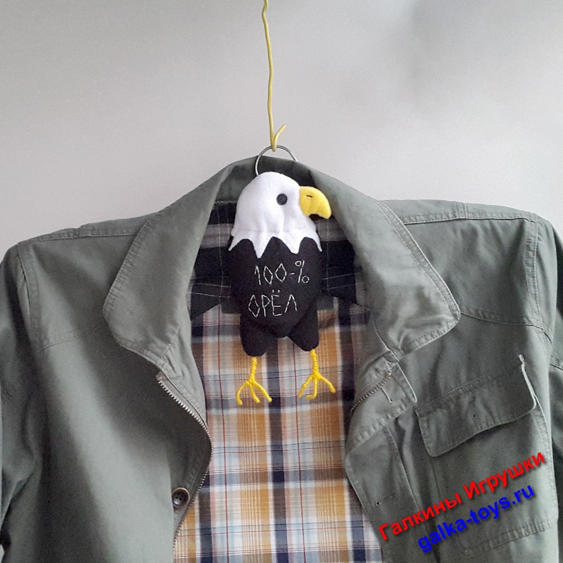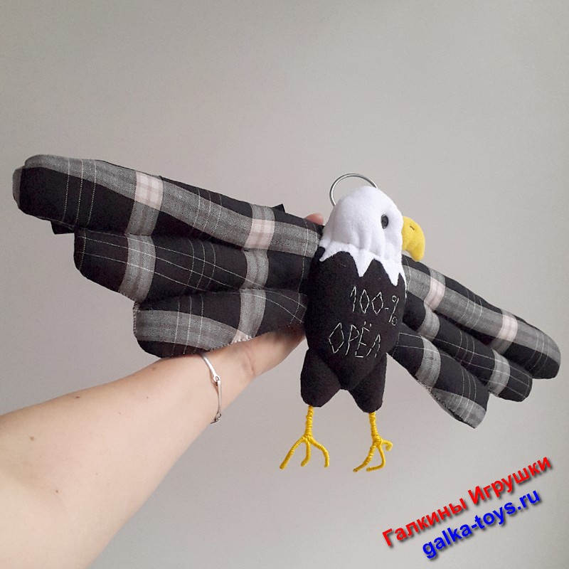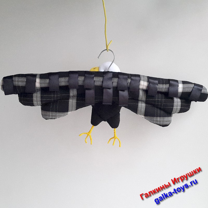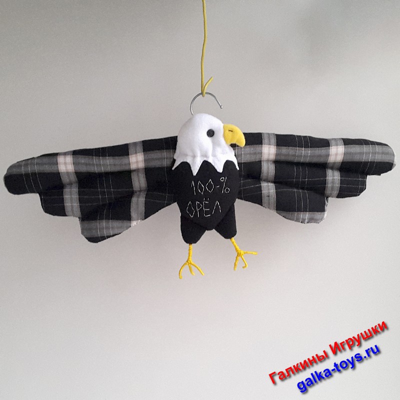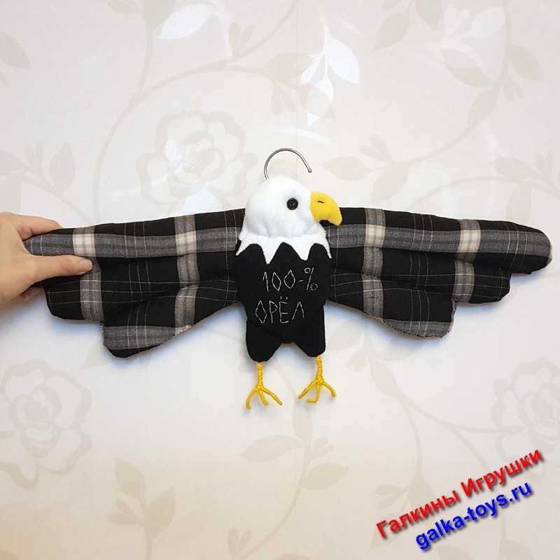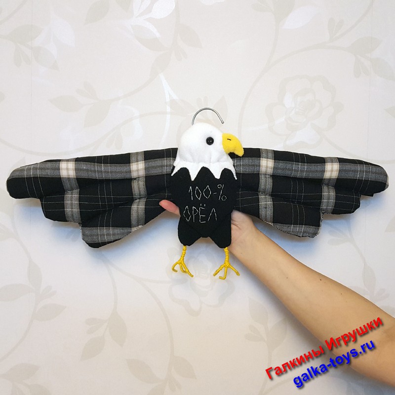 Это мягкая вешалка для одежды в виде белоголового орла. Орел мудрая птица сшита из клетчатой костюмной ткани и флиса, наполнена холлофайбером.
