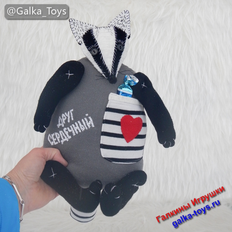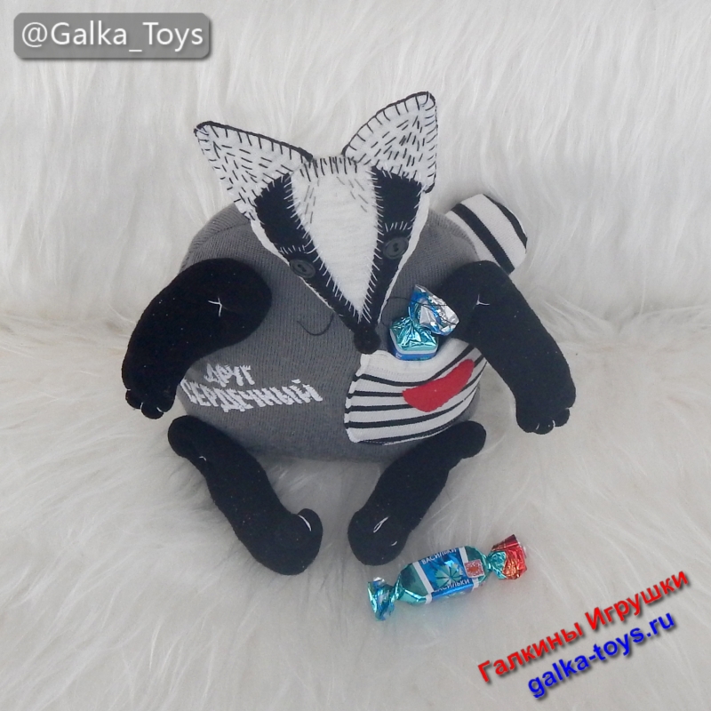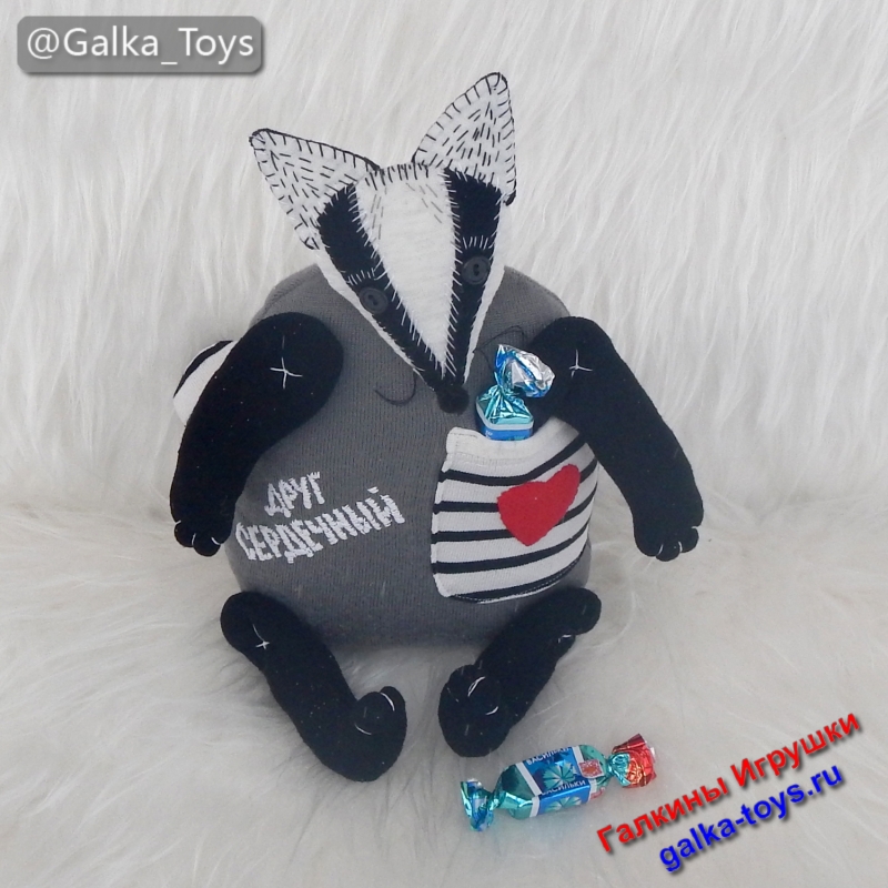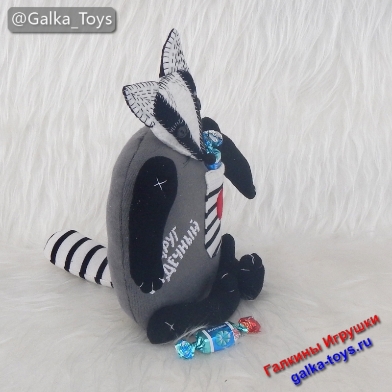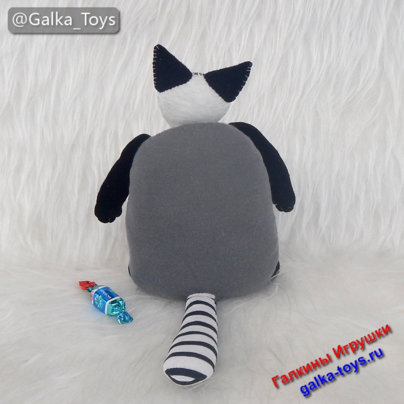 Материалы игрушки: Уютное тельце сшито из нежнейшего серого трикотажного полотна, а мордочка, лапки и ушки — из мягкого флиса. Хвост в модную полоску, как и полагается всем уважающим себя енотам! ?