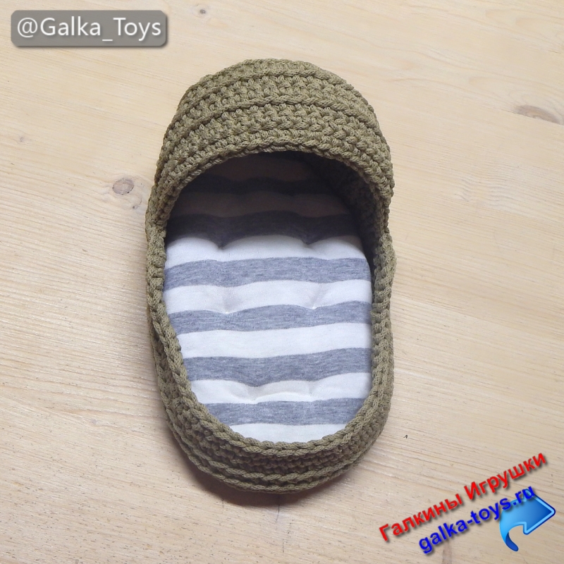 Но что за малыш без удобного гнёздышка? Конечно же, ему понадобилась кроватка для Пупсика — вязаная люлечка! Я связала её из прочного полиэфирного шнура, укрепила дно картонкой, чтобы держалась форма. Теперь у пупсика есть свой домик — люлька для Пупса крючком, но для полного комфорта нужно было добавить мягкости.