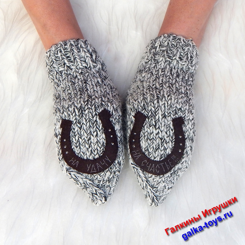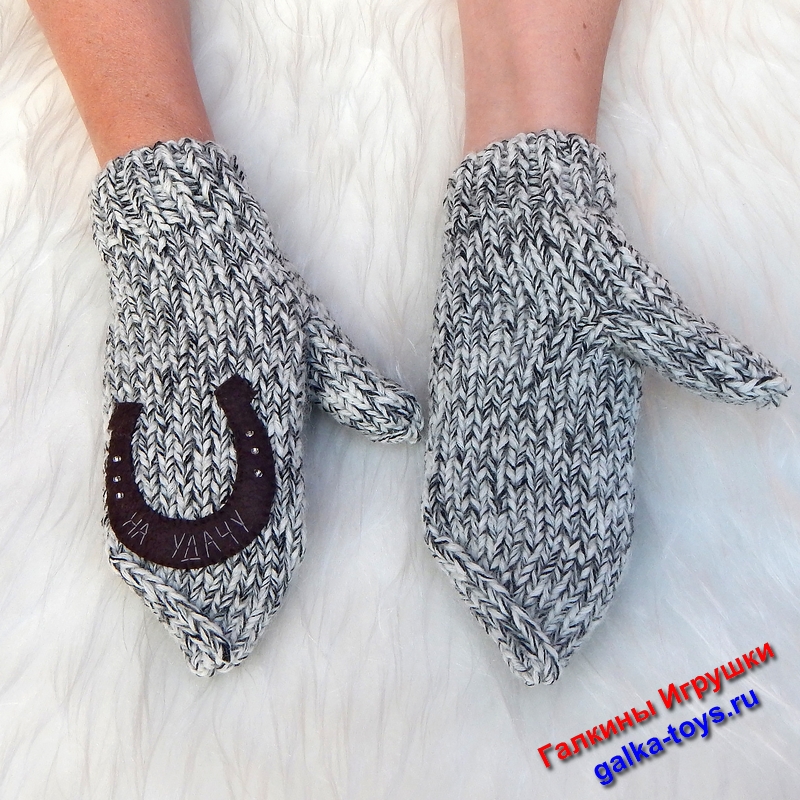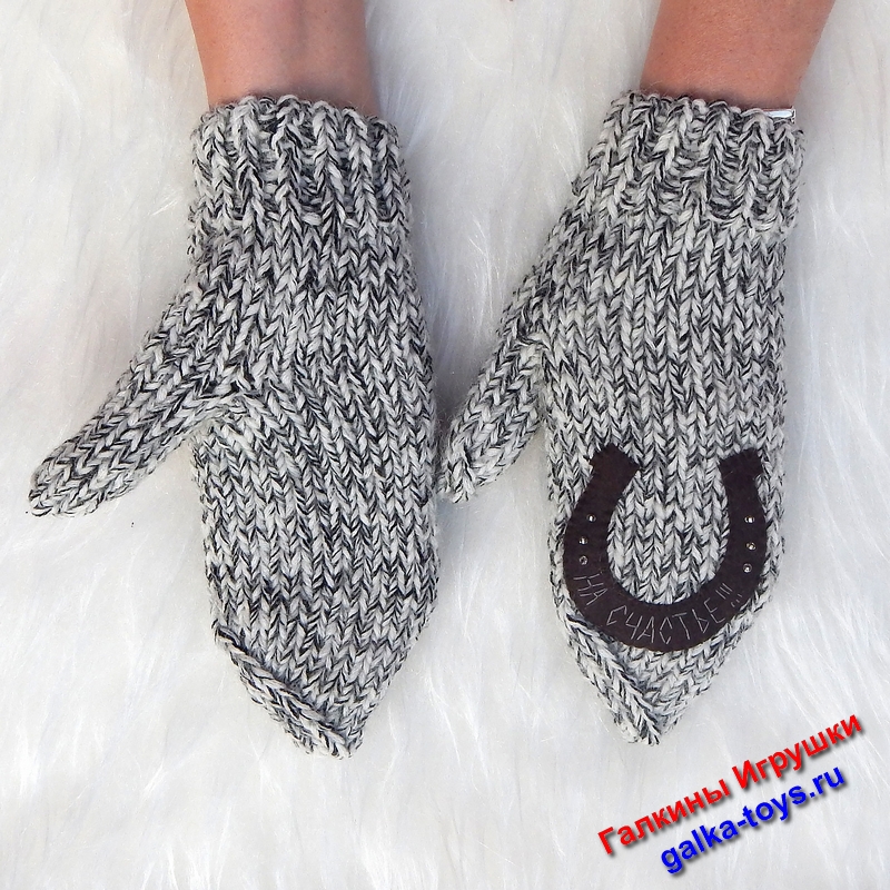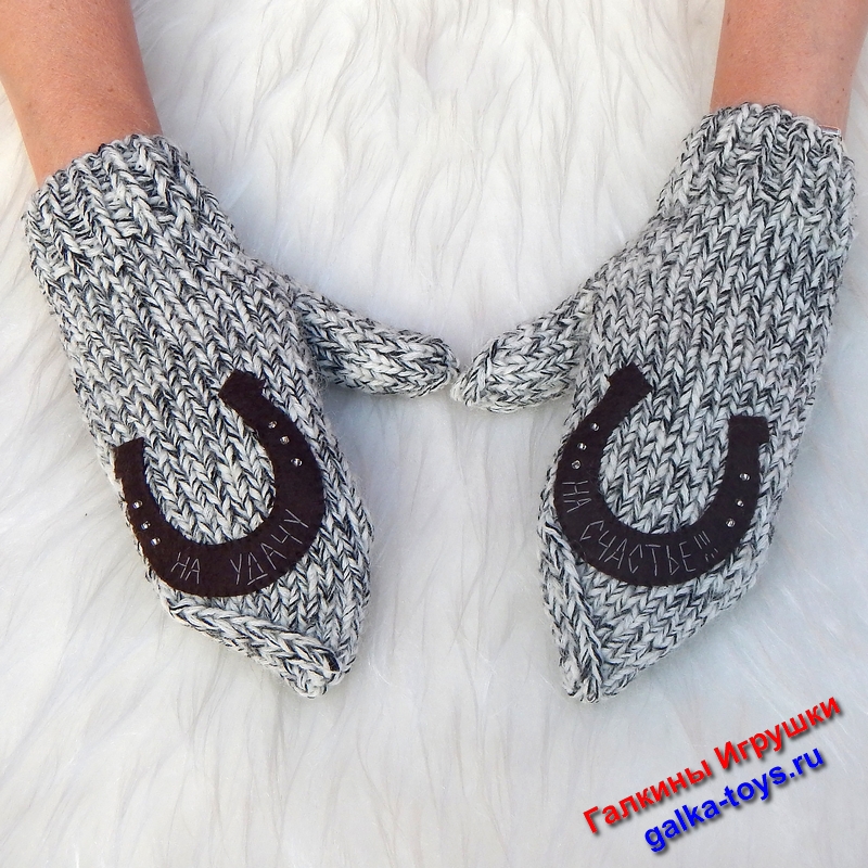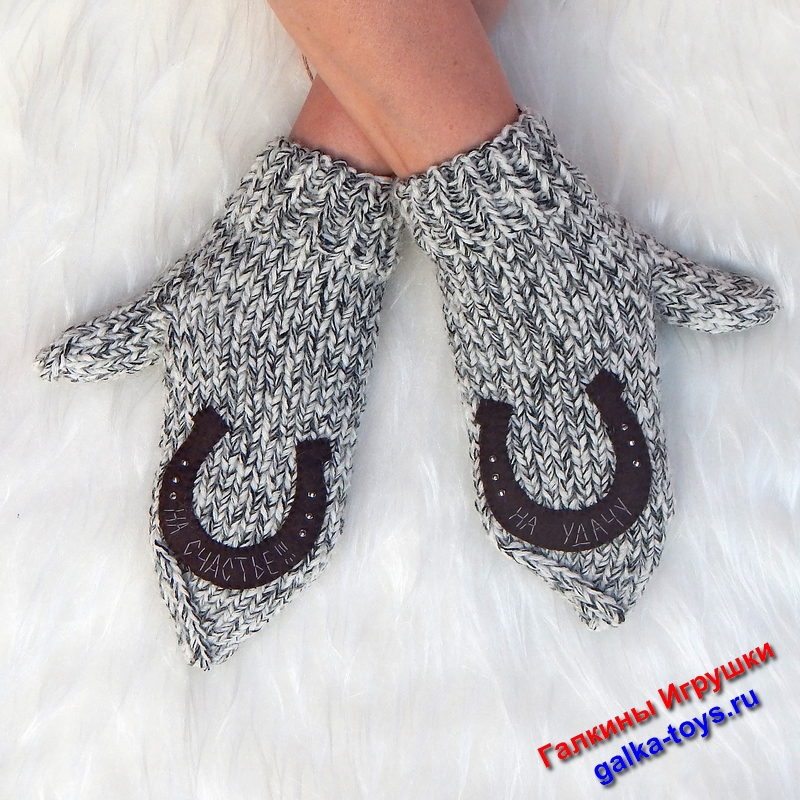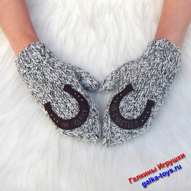 Женские рукавички будут не только греть ручки, но и нести энергетический заряд на удачу и счастье — аппликация в виде подковы.