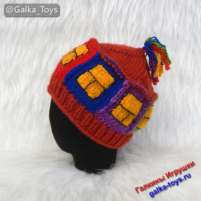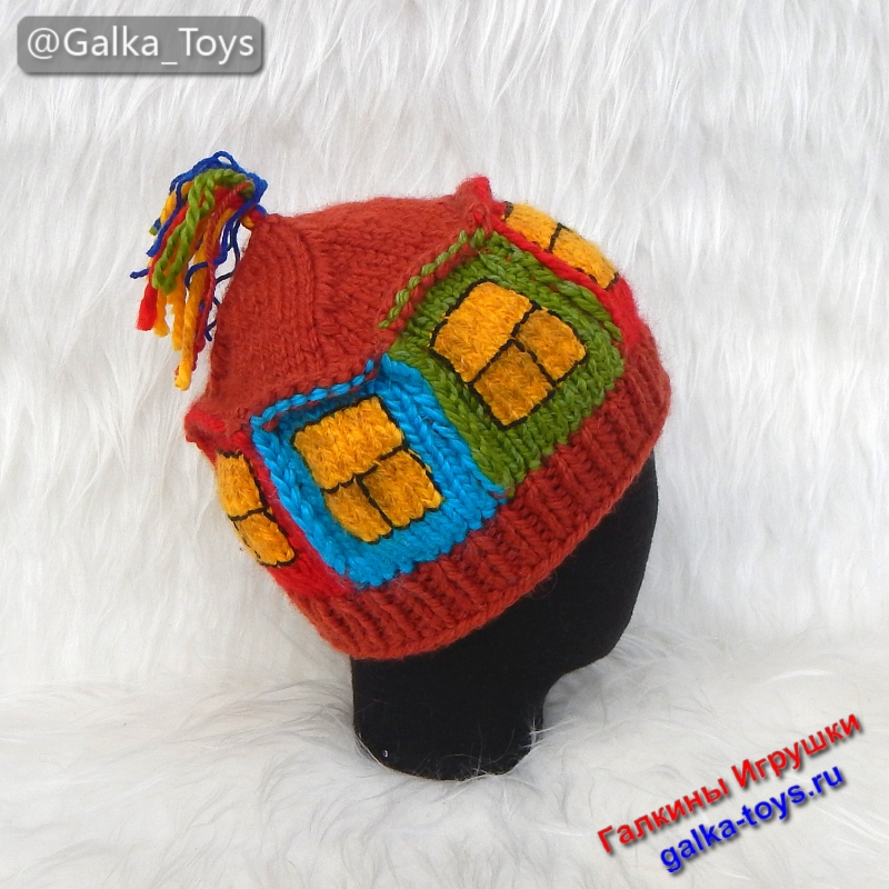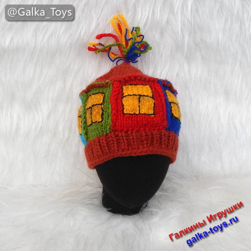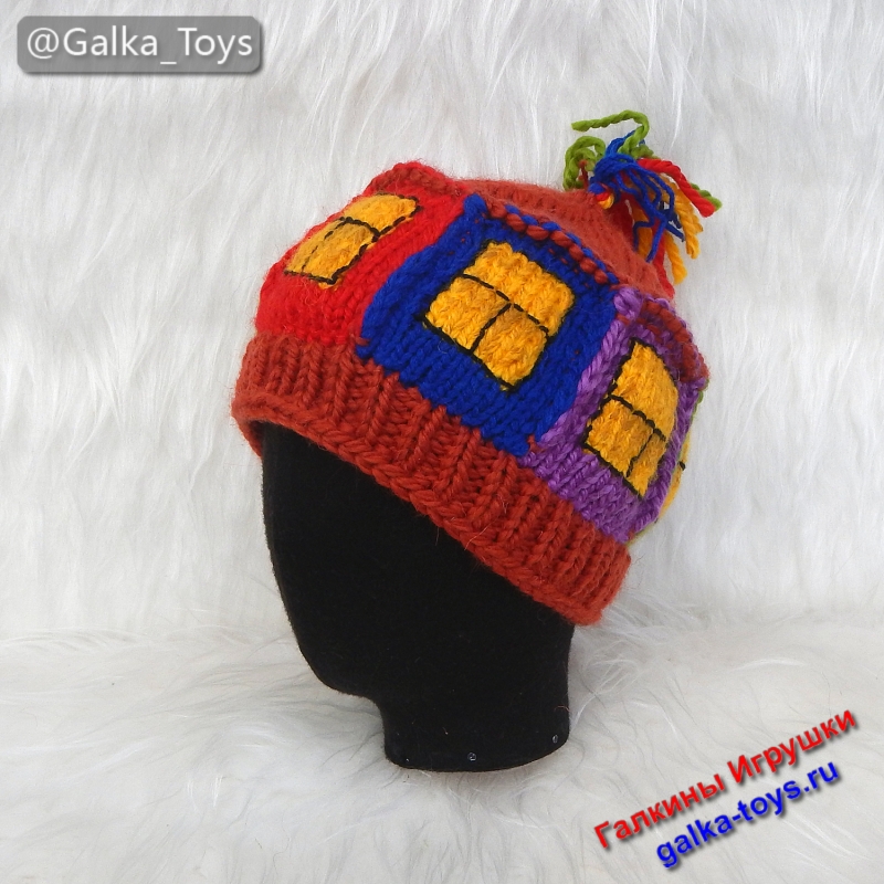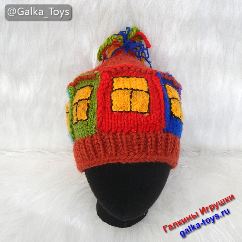 Связала эту прелесть и сама улыбаюсь: это же не просто аксессуар, а ваш личный генератор улыбок. ? Эта необычная вязаная шапка выполнена вручную из объемной полушерстяной пряжи. Основа — сочная терракота (цвет обожженной глины и осенних листьев), а на ней — целая история: окошки с желтым светом, синие и сиреневые наличники, зеленые… Всё как в сказке, только реально греет! ?