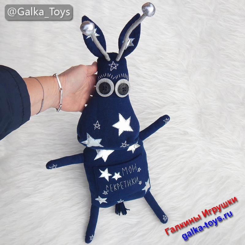 Он сшит из благородной синей пальтовой ткани, очень нежной и приятной на ощупь. Вместо обычных пятнышек появились деликатные серебряные звёзды из натуральной кожи — словно маленькие искорки света в вечернем небе. ?
