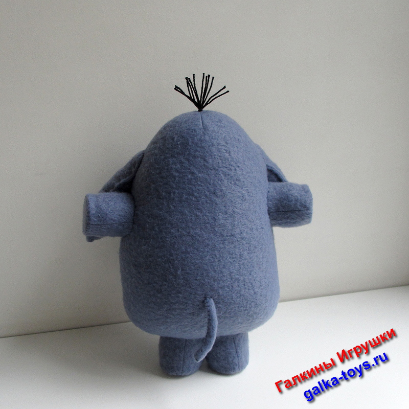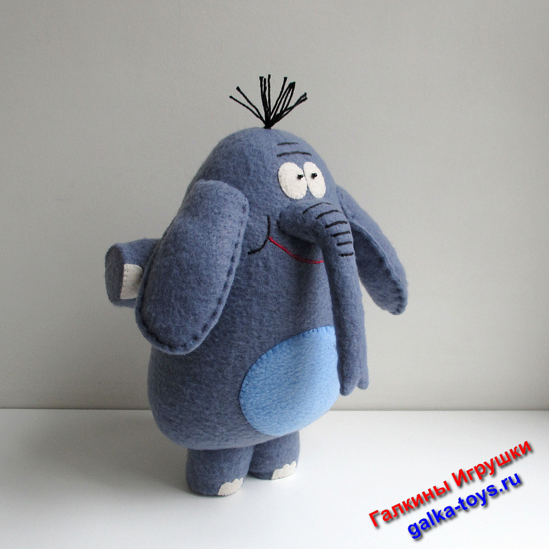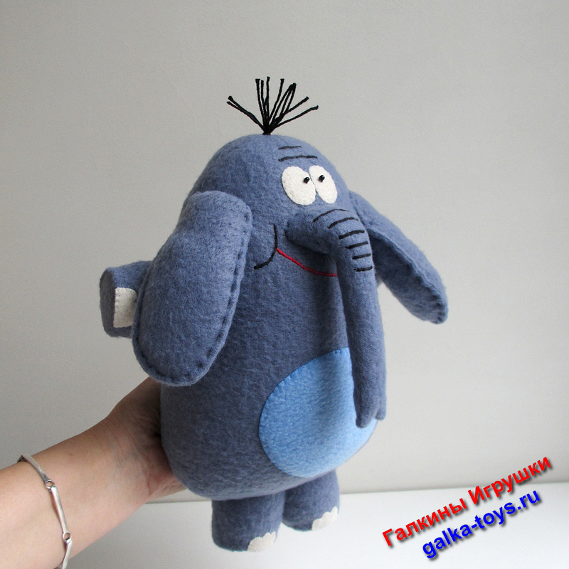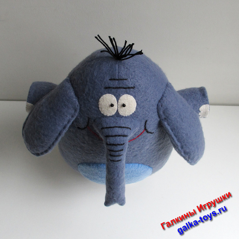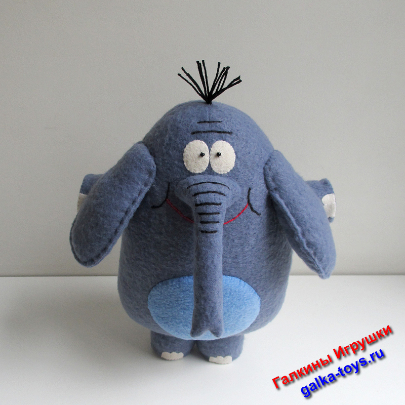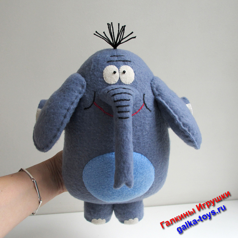 Мультяшный слон сшит из серо-голубого флиса, наполнен холлофайбером.