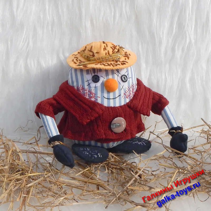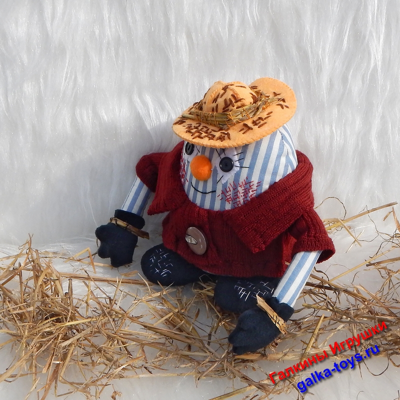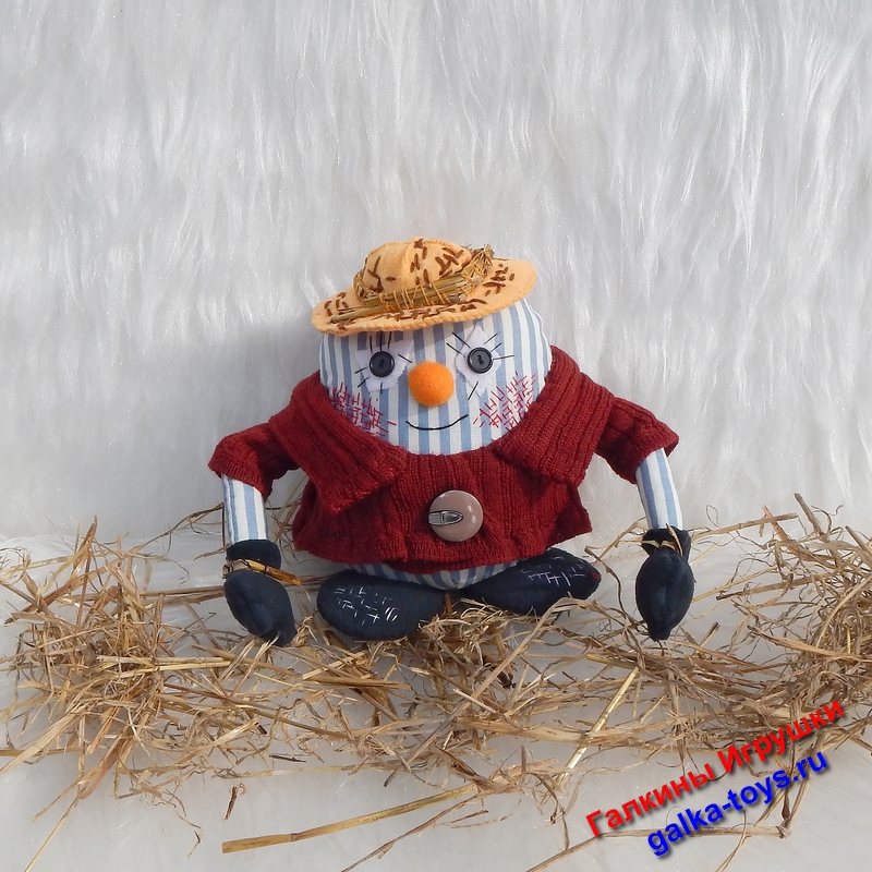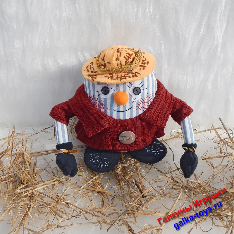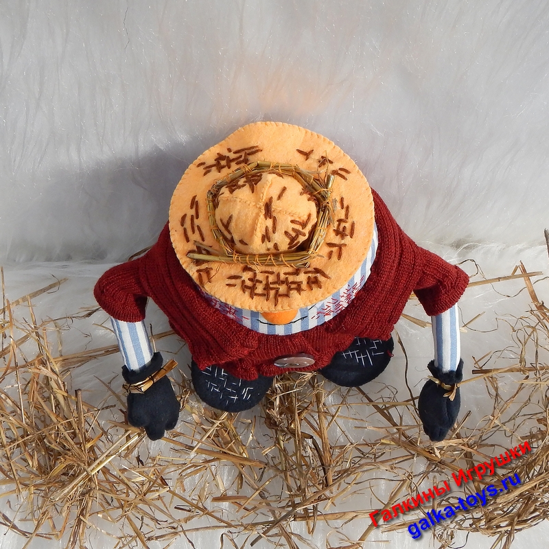 Страшила мягкая игрушка сшит из хлопчатобумажной полосатой бязи. Наполнен холлофайбером, «украшен» натуральной соломой.