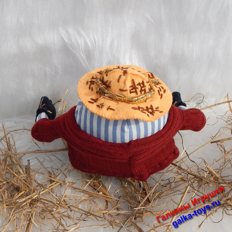Вполне себе симпатичное создание. Раньше был просто огородным пугалом. Поэтому и одежда у игрушки соответствующая: штопаная и в заплатках.