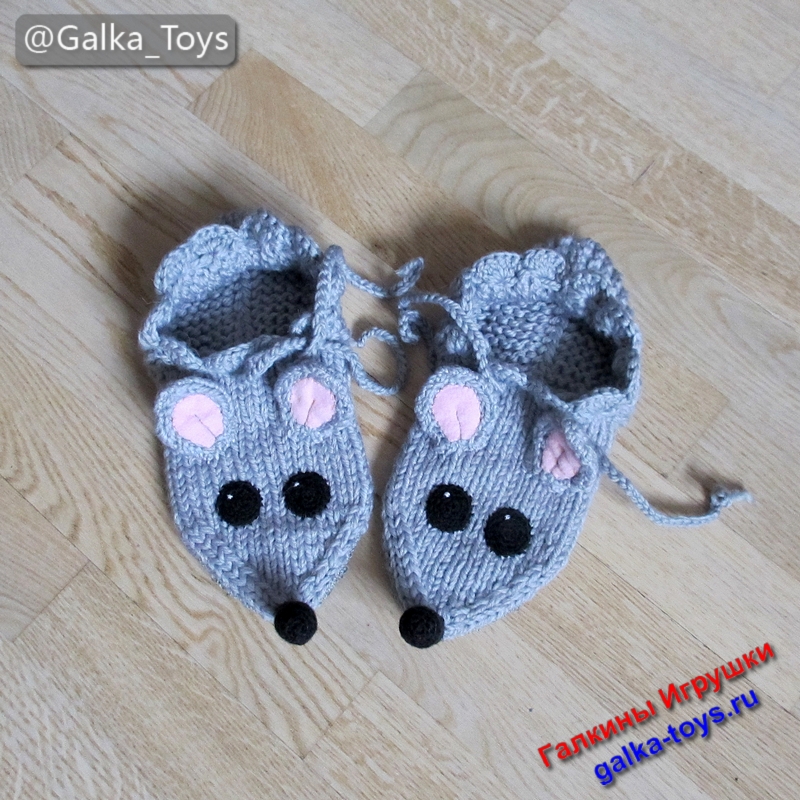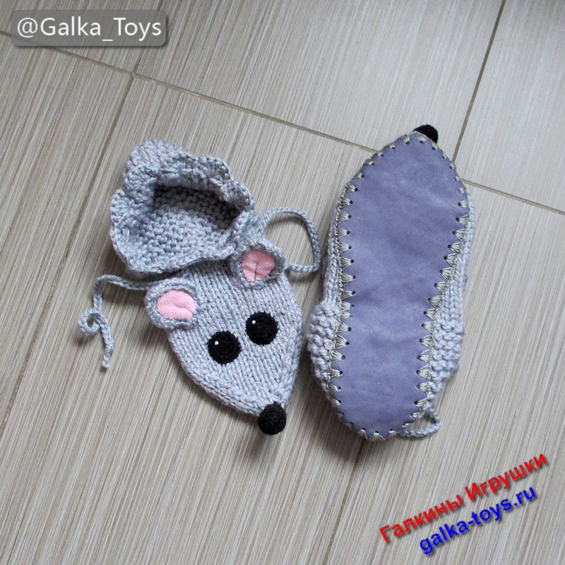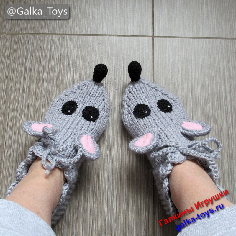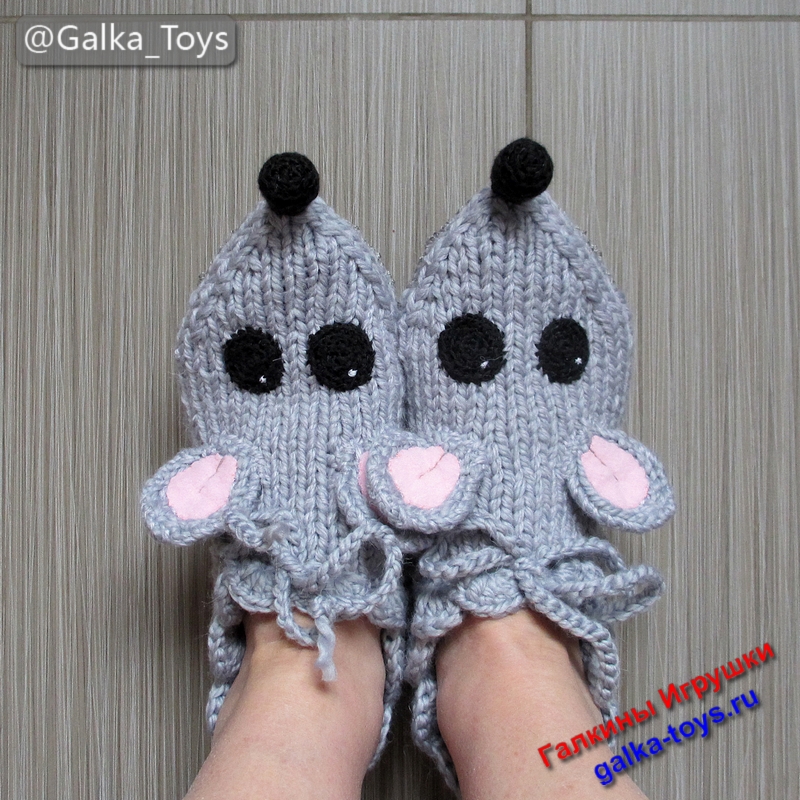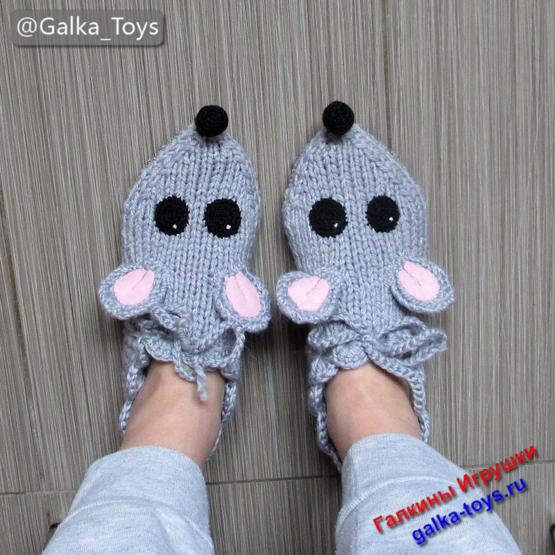 Эти тапки мыши настолько теплые и мягкие, что не захочется снимать их даже летом! Связаны они спицами из толстой полушерстяной пряжи серого цвета.