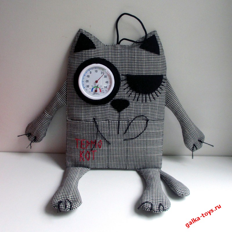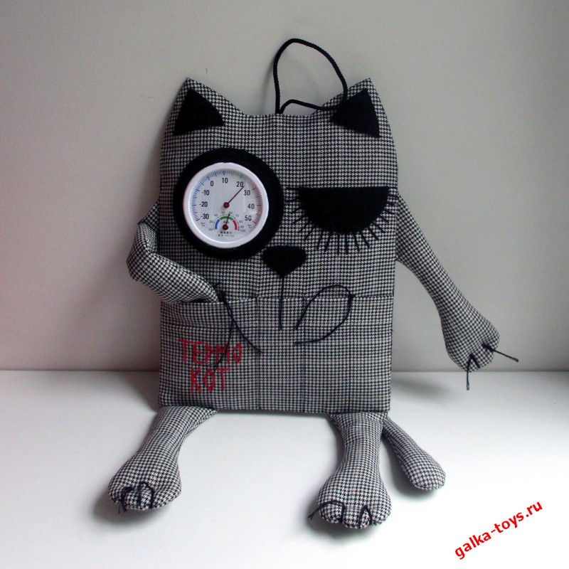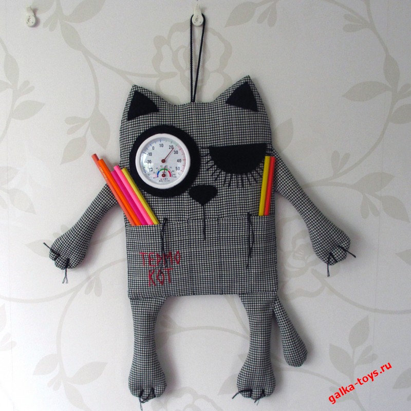 Целиком и полностью согласен с этим наш кот. Он непростой, это кот с термометром! Будет отслеживать температуру, а заодно и влажность в Вашем доме. У него есть кармашки, в которые легко можно разместить разноцветные карандаши или фломастеры, а также — маленькие записочки. В случае перепадов температур, поможет быстренько что-нибудь яркое нарисовать или написать для стабилизации. Отличный подарок любителям термо-котов