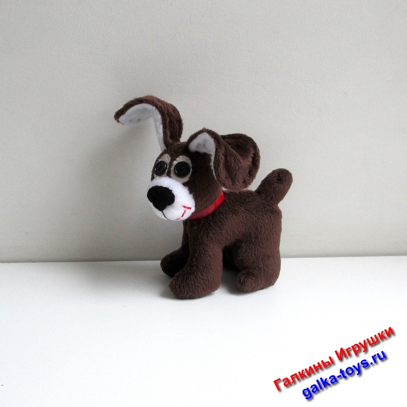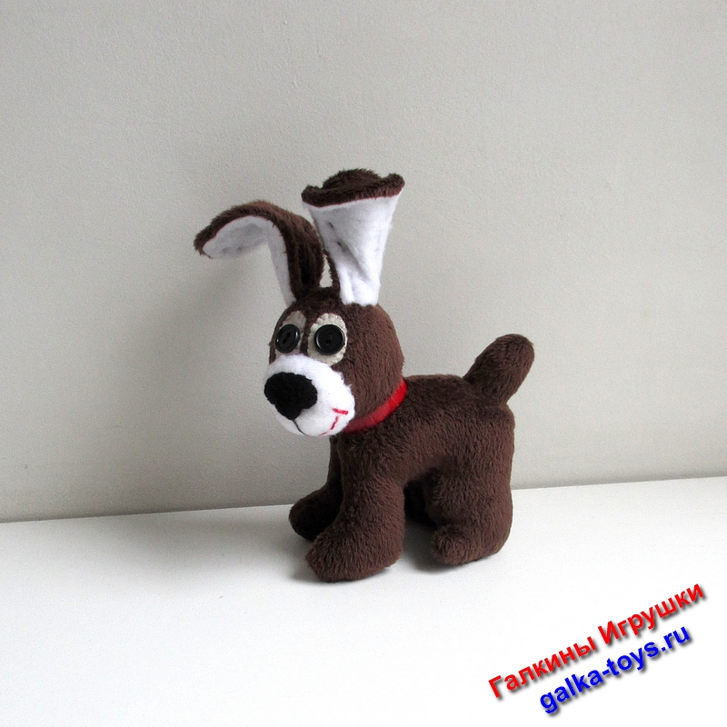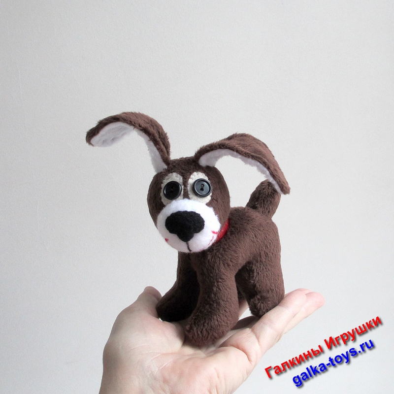 Собачка сшита из искусственного меха, ушки и мордочка отделаны белым флисом. Глазки- пуговки с бусинками, носик из пластмассы.