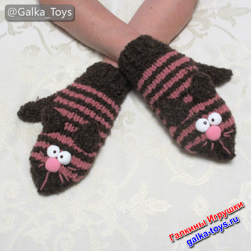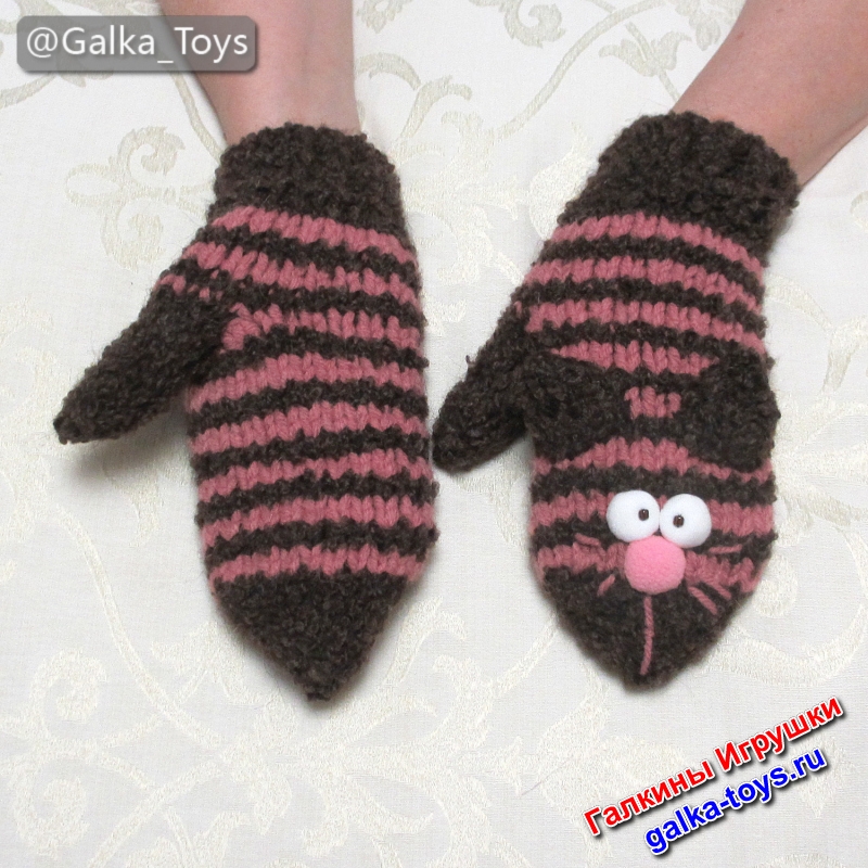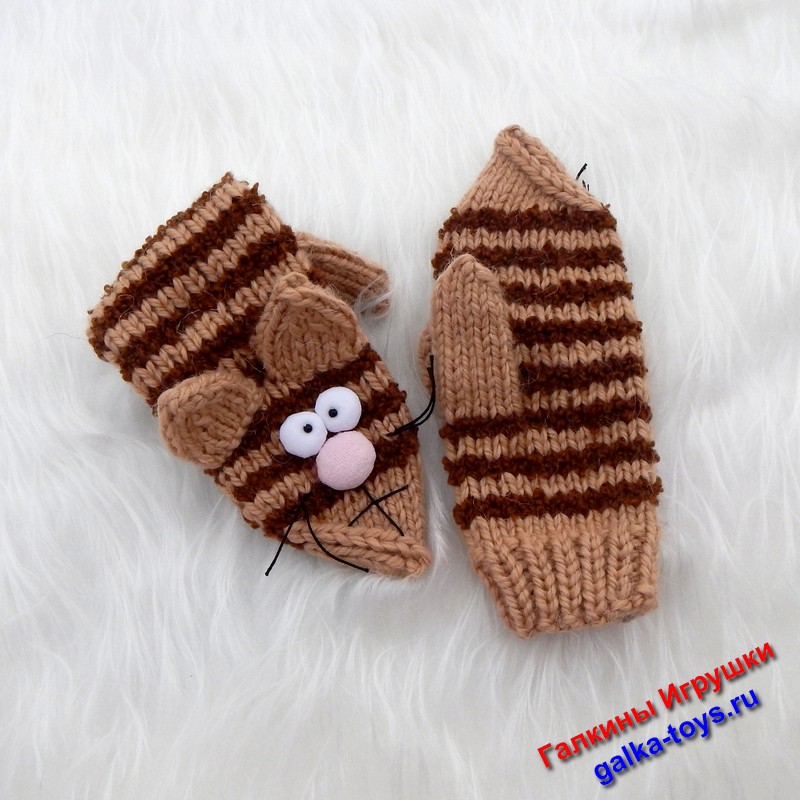 Вязаные спицами женские варежки с полосатыми котиками
