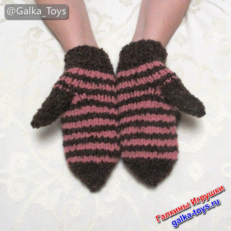 Мягкая полушерстяная пряжа тёплого коричневого цвета стала уютной основой, а брусничные полоски добавили рукавичкам искру, как улыбку в пасмурный день.