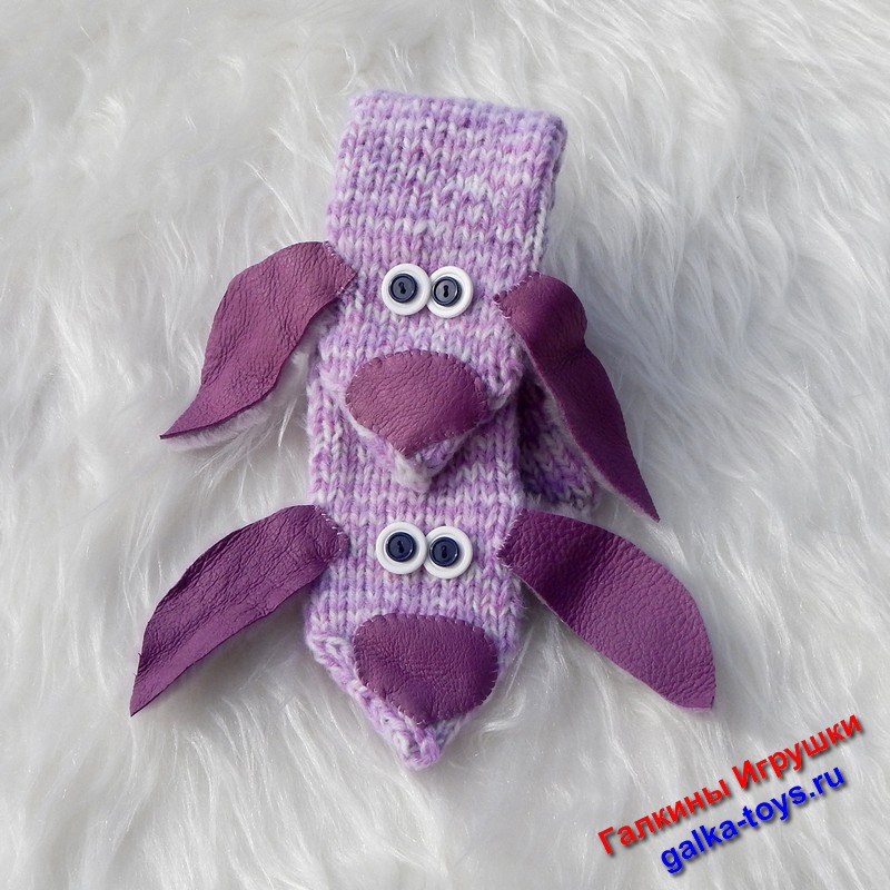 Красивые варежки связаны спицами из полушерстяной пряжи и украшены симпатичными мордашками собачек, уши из натуральной овчины, глаза — пуговицы. Милые песики очень любят веселиться и играться, их большие ушки при этом забавно шевелятся.