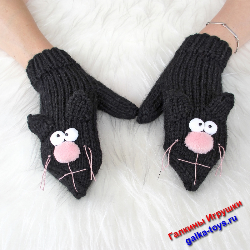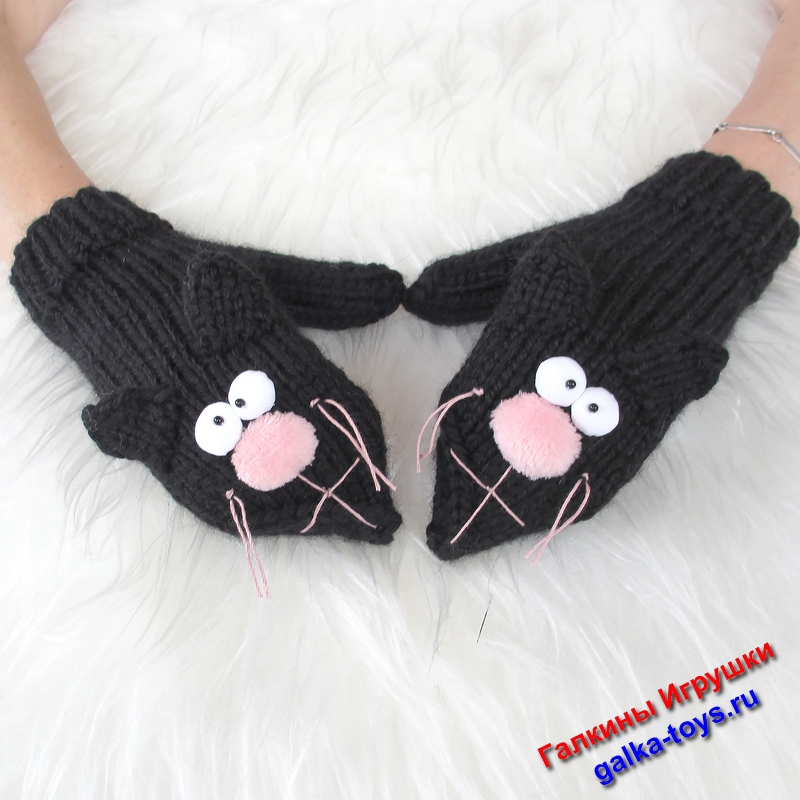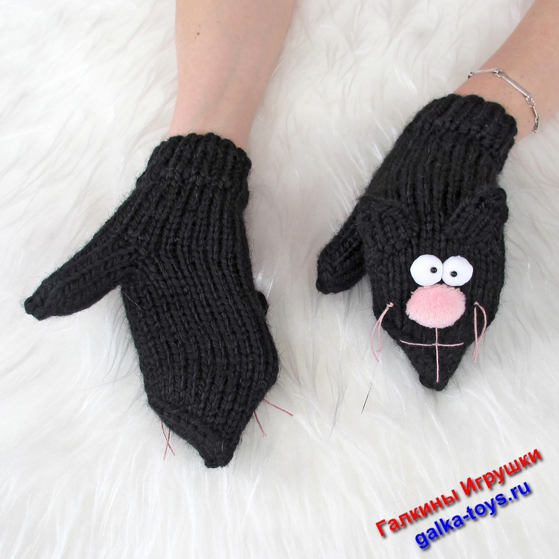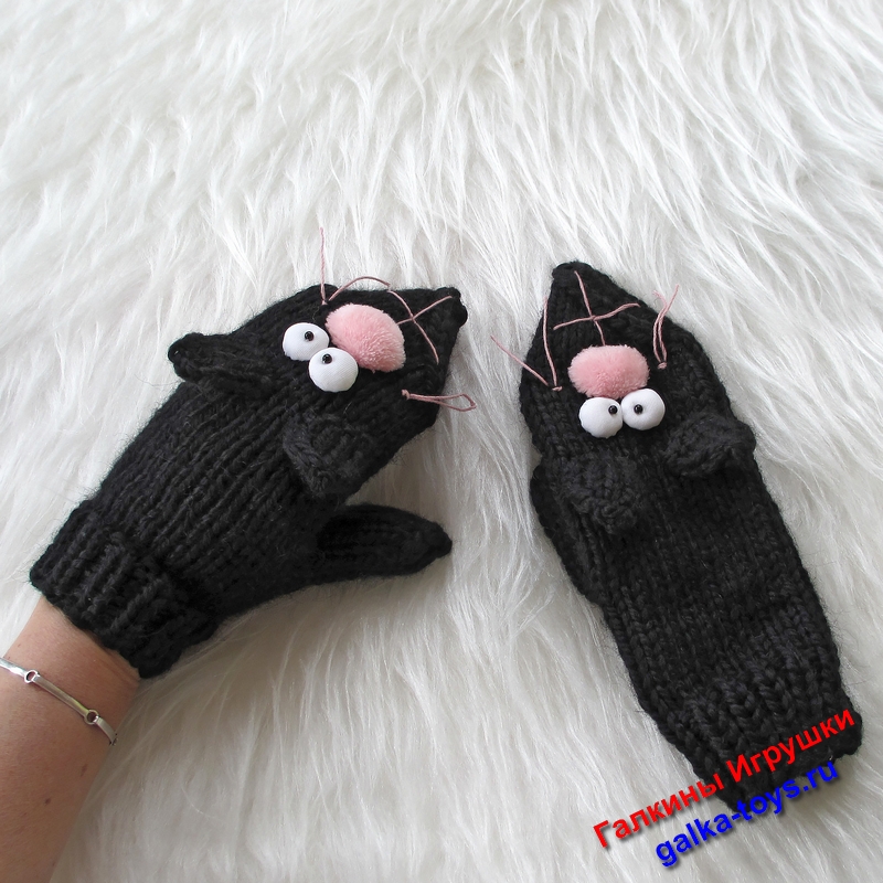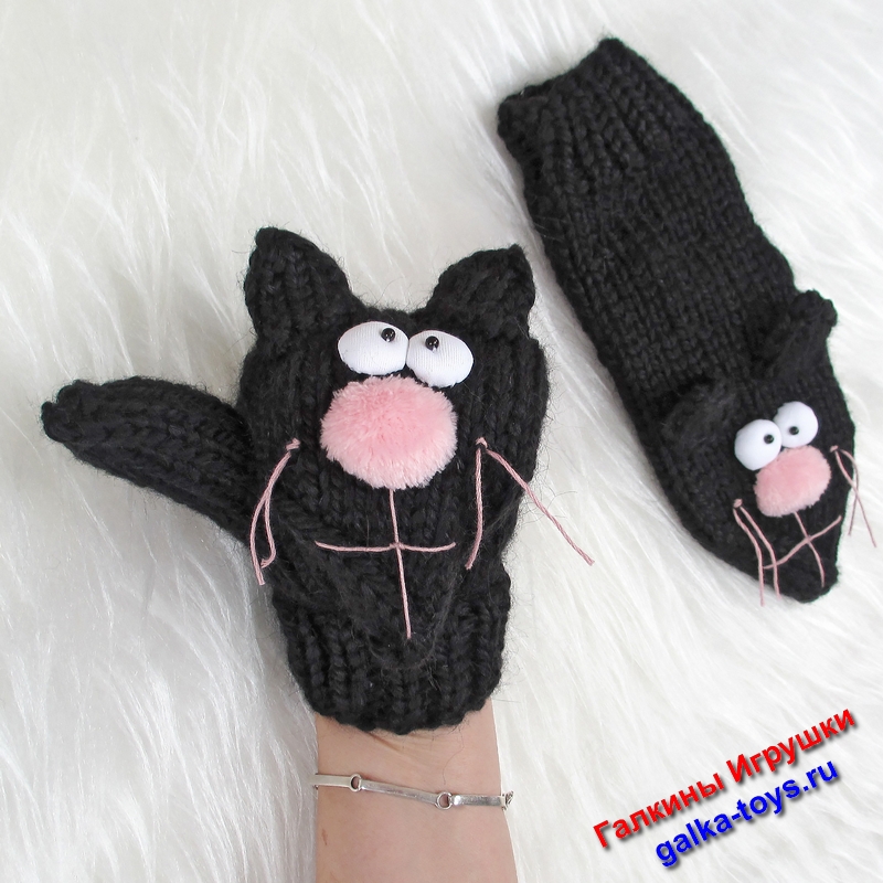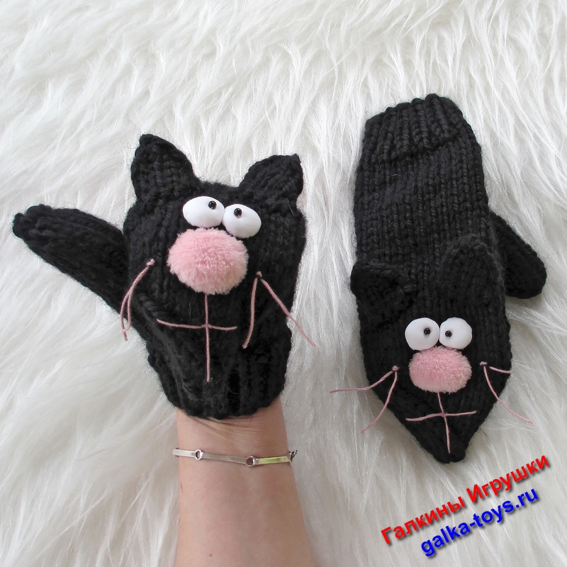 Обратите внимание на вязаные варежки спицами два черных кота. Живут дружно, веселятся играют друг с другом, не царапаются.