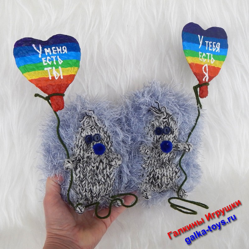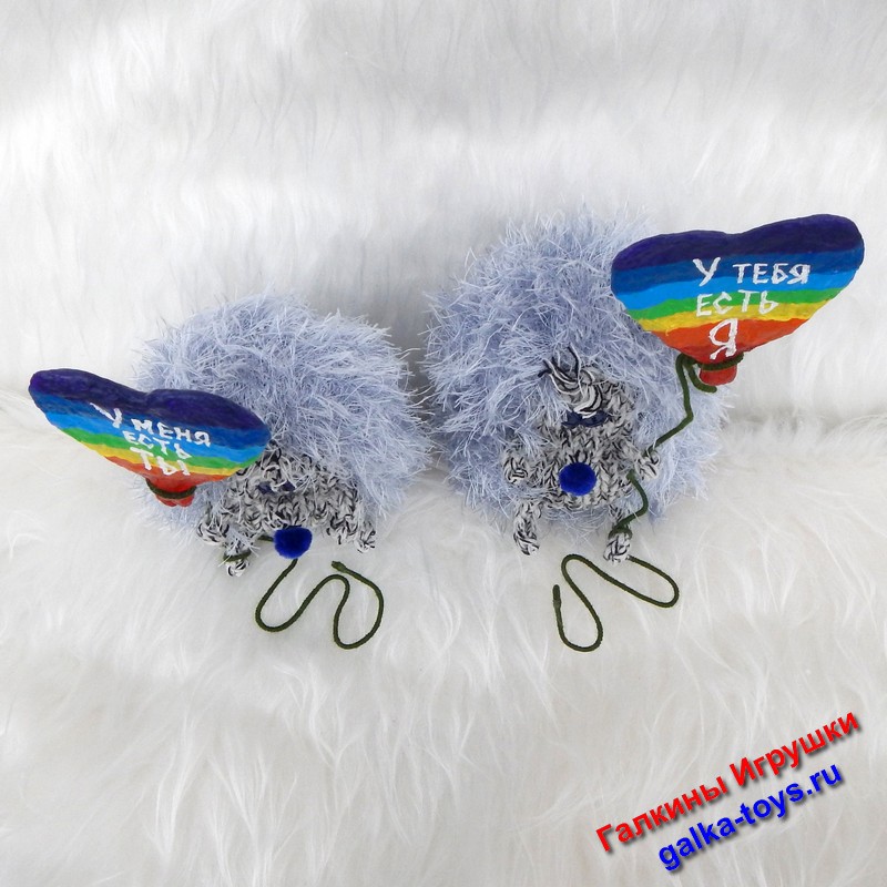 Животик, ручки и ножки из серо — белой полушерстяной меланжевой нитки, иголочки — пряжа травка, носик — синий помпон, глазки — пуговки, наполнитель — холлофайбер.