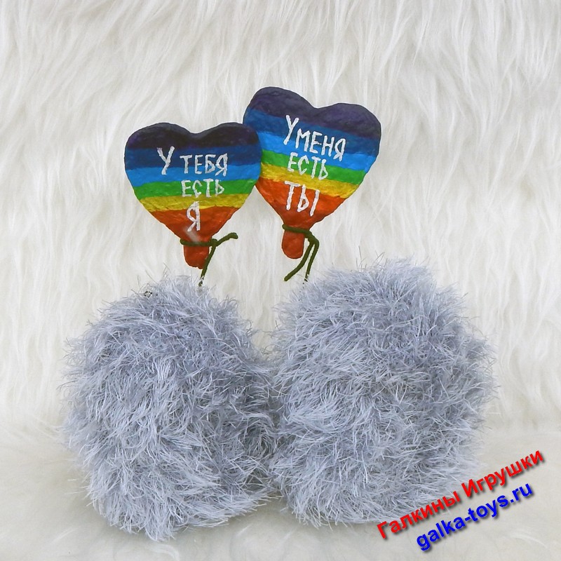 Пузико ручки и ножки из серо — белой полушерстяной меланжевой нитки, шкурка — пряжа травка, носик — синий помпон, глазки — пуговки, наполнитель — холлофайбер.