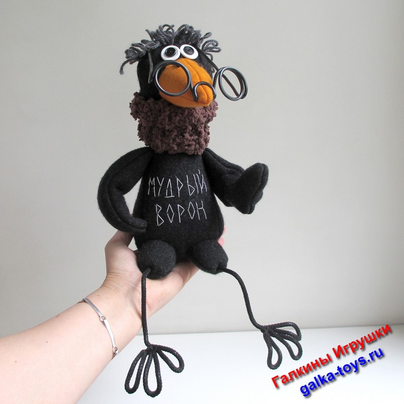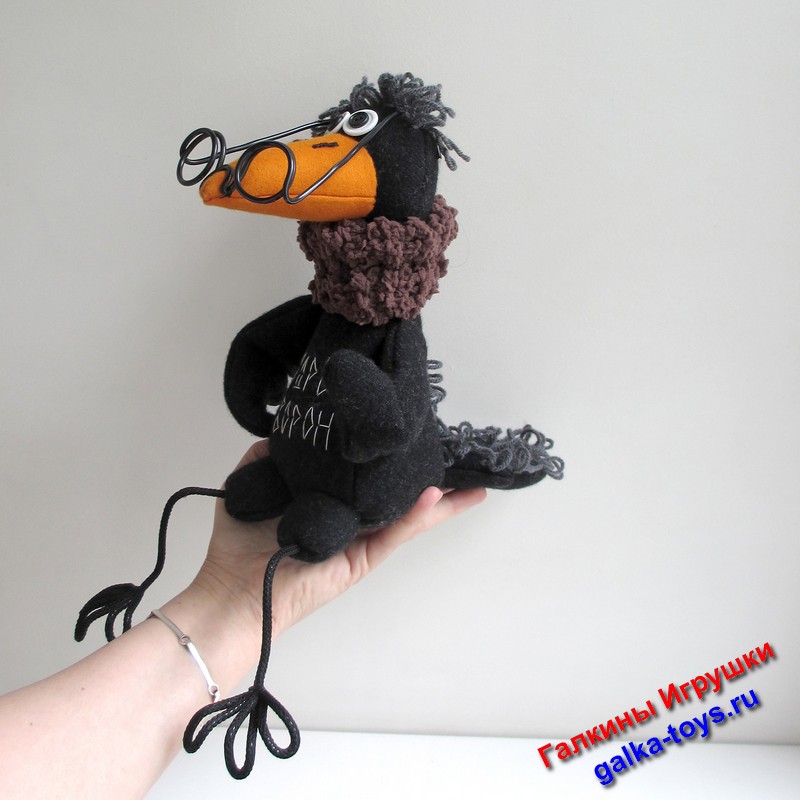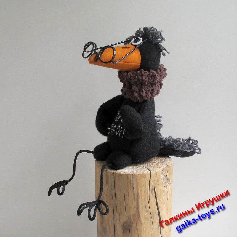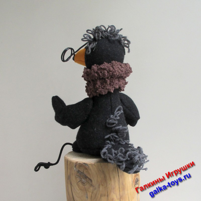 Интерьерная игрушка — сшита из черной шерстяной пальтовой ткани, прическа из полушерстяной пряжи, очки и лапки из проволоки, глаза — пуговицы. Клюв оранжевый из сукна, наполнитель — холлофайбер.