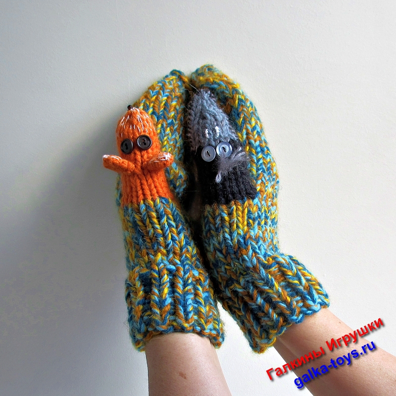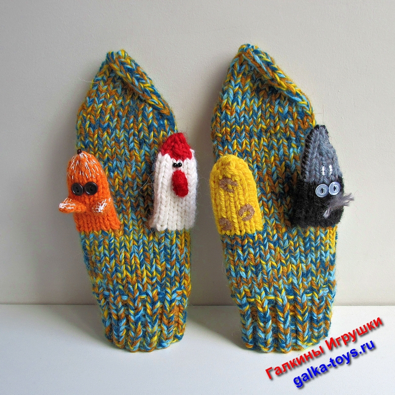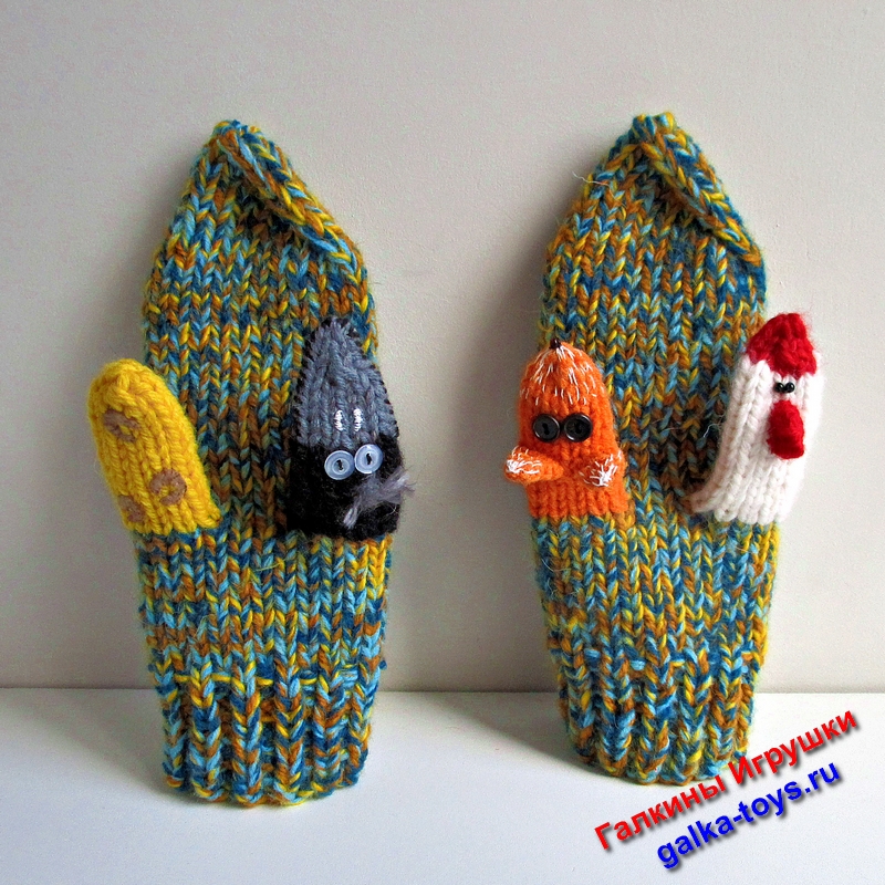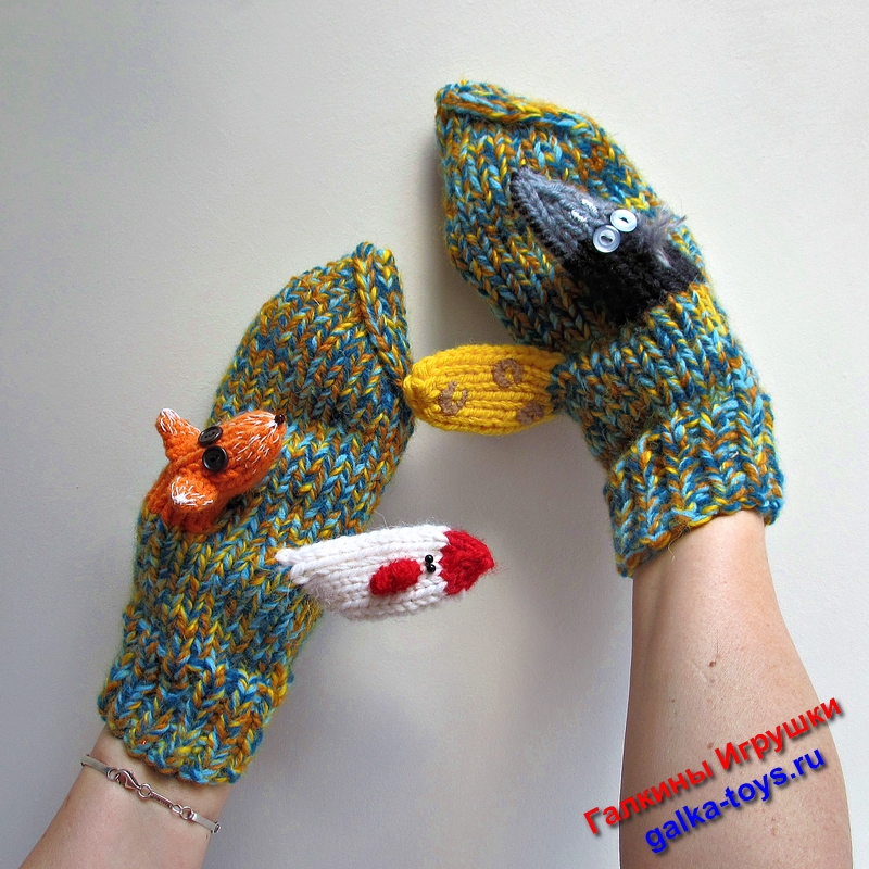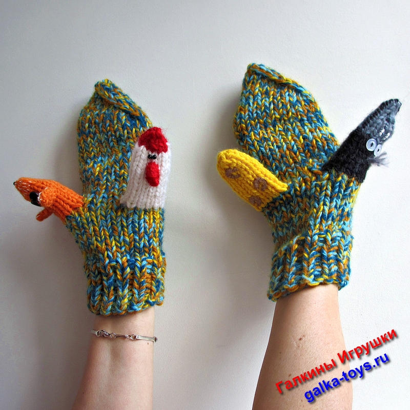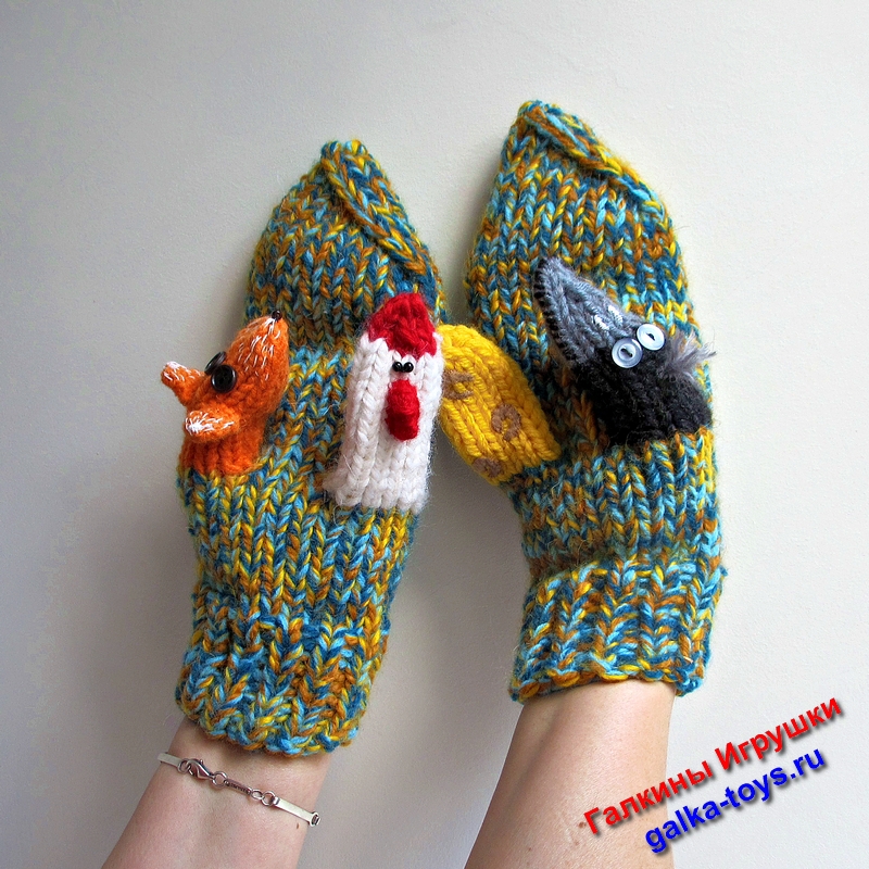 Во-вторых, они очень смешные. Каждая варежка сказка имеет по два больших пальца, причем вывязаны в виде персонажей сказок и басен.