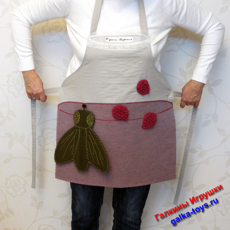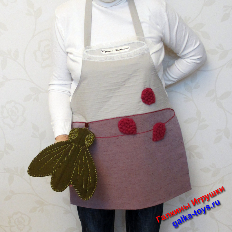 Главная изюминка — объемный декор. На самом видном месте «баночки» красуются три сочные ягоды малины. Они связаны вручную из мягкой полушерстяной пряжи, что делает этот фартук ручной работы по-настоящему уютным, теплым и тактильным.