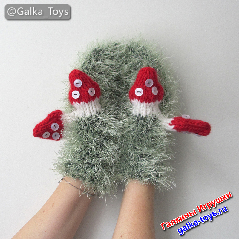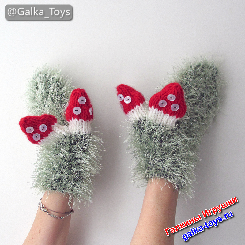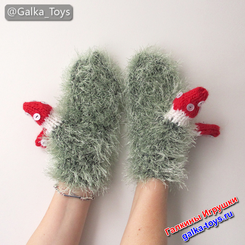 Самое забавное — варежки на любую руку: не нужно гадать, где левая или правая. А на больших пальцах — весёлые вязаные грибы мухоморы!