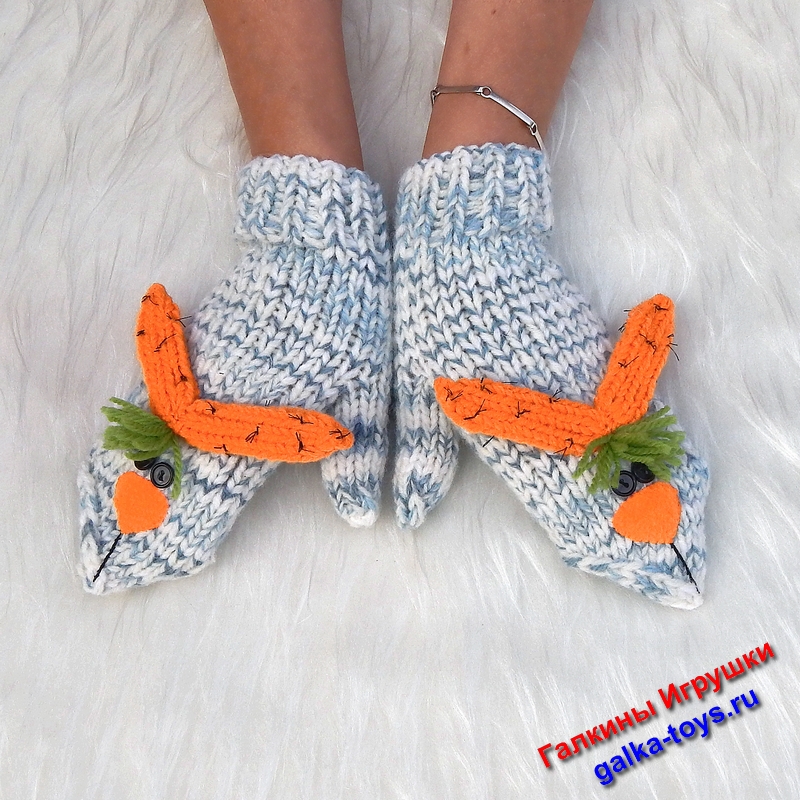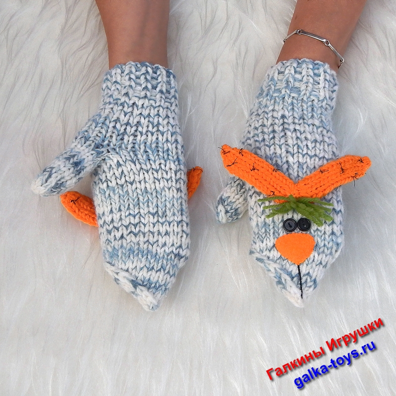 Встречайте новые вязаные спицами женские варежки смешные зайцы.